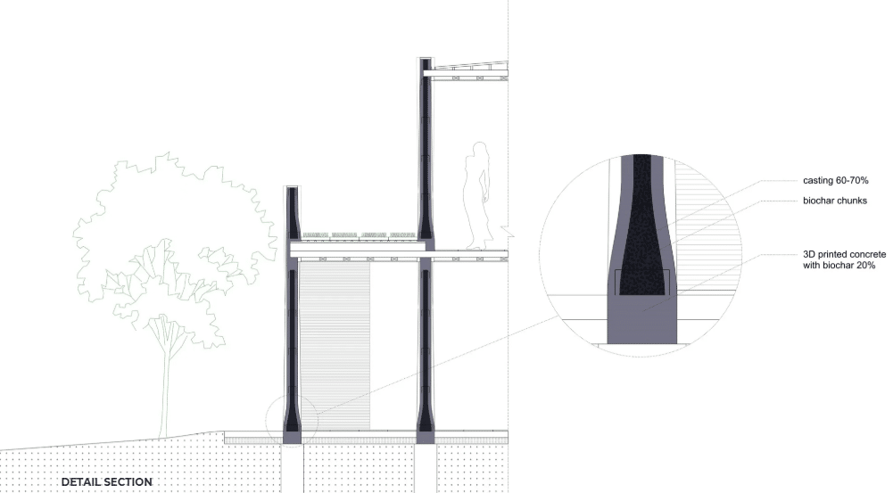 The design integrates carbon-storing features, meaning the wall not only avoids carbon emissions but also helps store carbon inside its form.