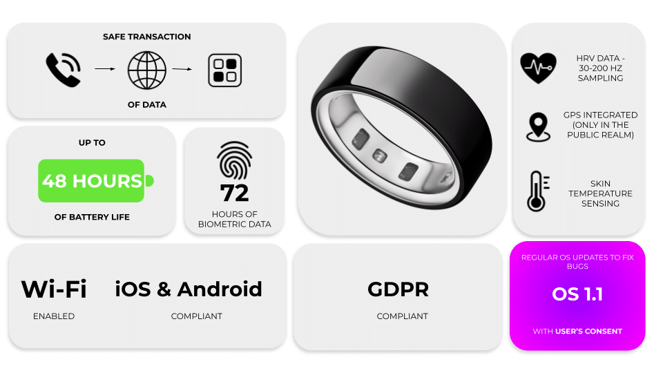 Critically, the combination of compact hardware and local processing allows the ring to maintain accuracy while preserving user autonomy and data security, differentiating it from cloud-dependent wearables.