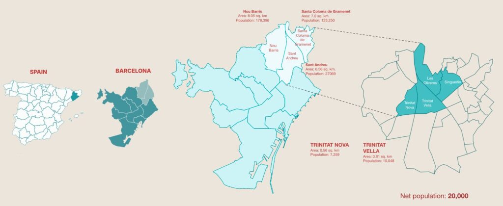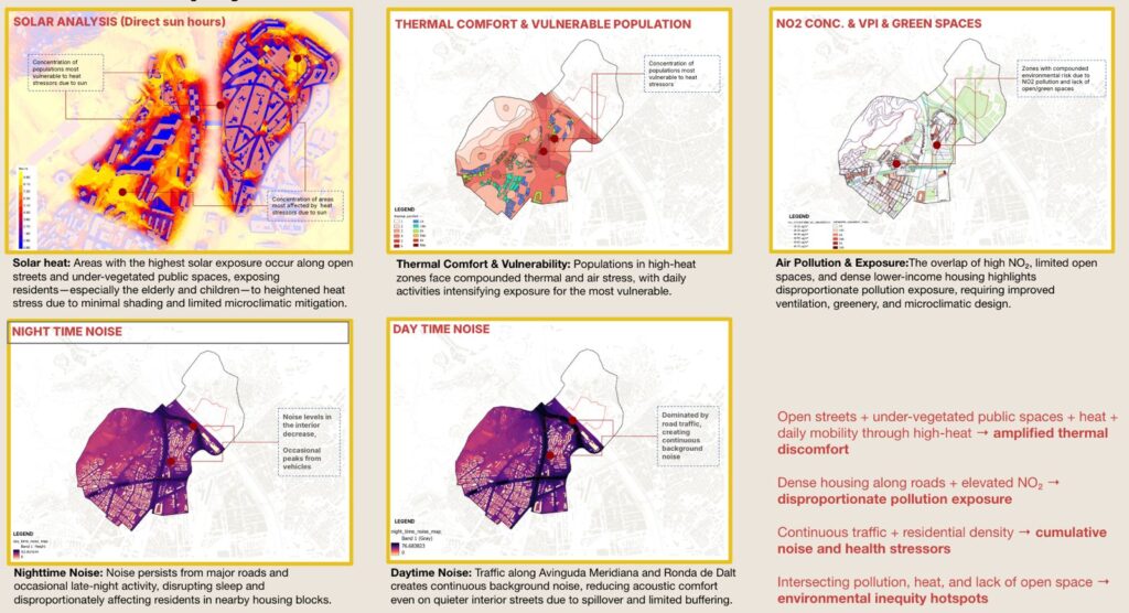 Trinitat Nova, Trinitat Vella and La Trinitat are three neighbourhoods in Barcelona separated by 600 metres and divided by decades of infrastructure built for the city rather than for the people who live in it.** Ronda de Dalt — a six-lane open-cut highway — severs ecological continuity, buries the 10th-century Rec Comtal waterway beneath concrete, and makes a journey that should take four minutes take thirty-five for the 31% of residents over the age of 65. Avinguda Meridiana adds eleven lanes of traffic and double the legal NO₂ limits. Between them, the two barriers have split two communities that are geographically proximate into separate urban lives.This project — developed as part of the C40 Reinventing Cities competition at IAAC — set out to locate where fragmentation is most severe, identify where intervention would have the highest spatial leverage, and propose design strategies grounded in what the analysis demanded rather than what the designers preferred.