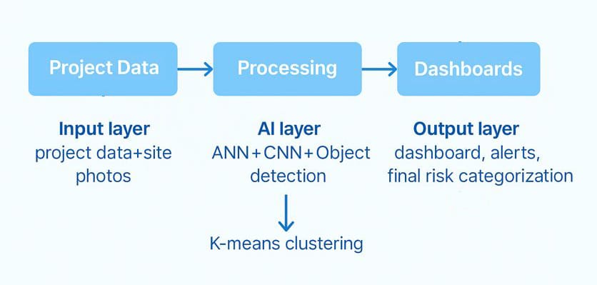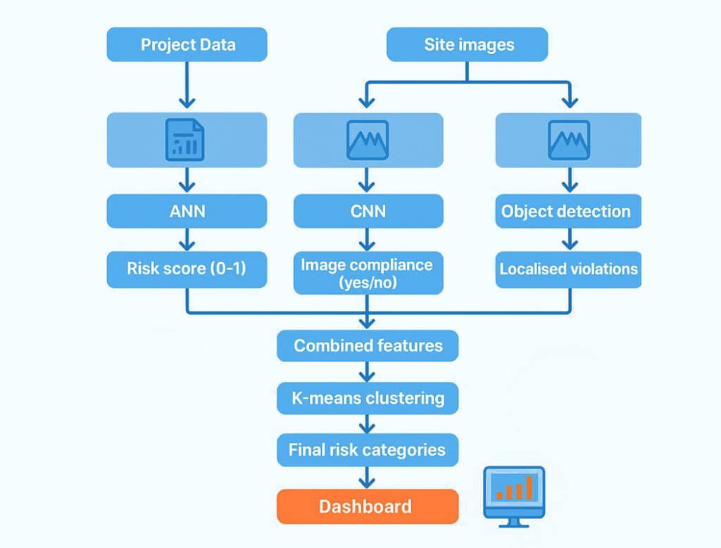 It integrates structured project data and unstructured site imagery into a multi-model AI pipeline for compliance risk assessment. Project-level features and image-based predictions are processed in parallel and then fused into a unified representation for risk analysis. The resulting outputs are delivered through dashboards and automated alerts, enabling project managers to prioritize inspections and initiate corrective actions at early stages of construction.