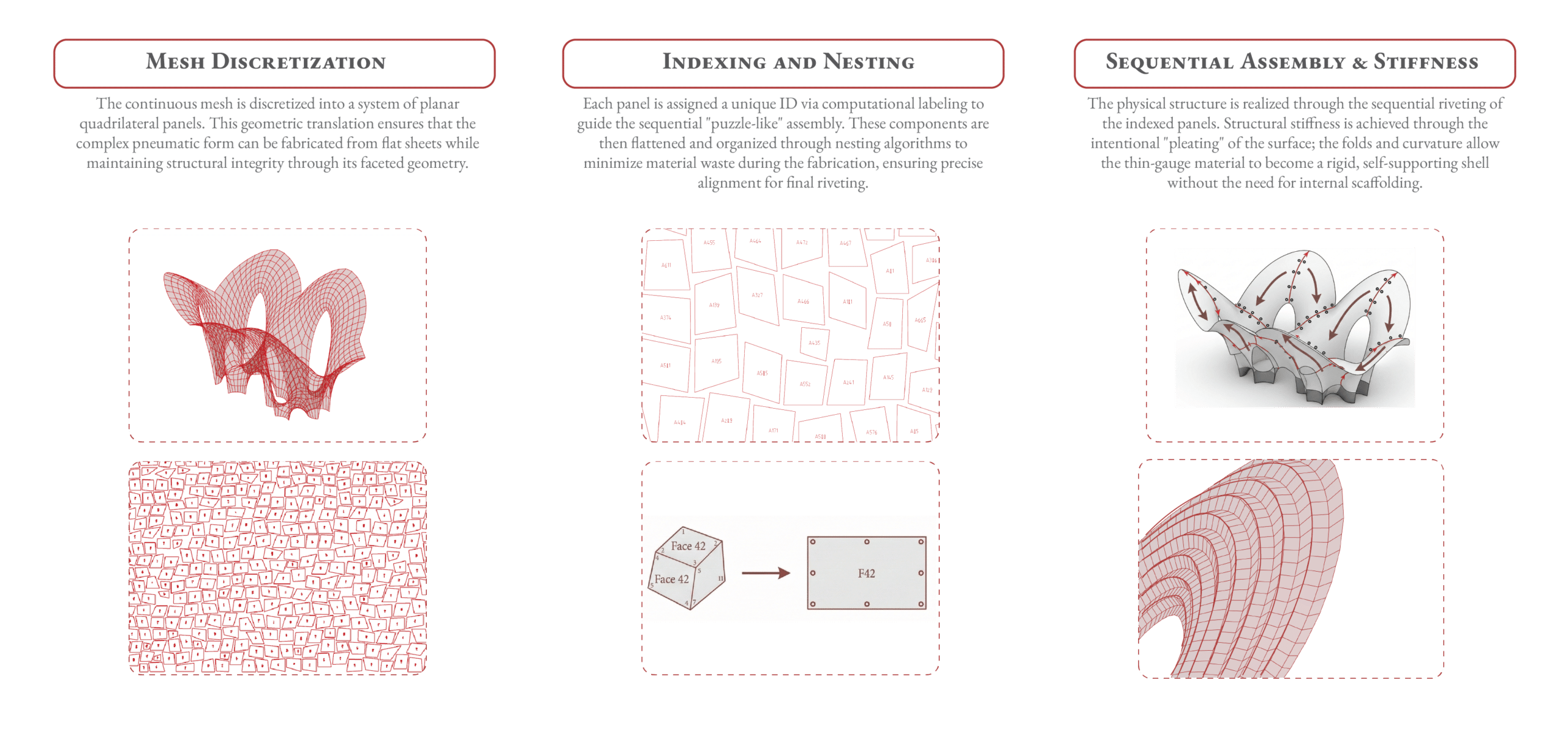 At the micro-level, structural integrity is achieved through two techniques: “pleating” (continuously folding the surface into a zigzag to increase depth and rigidity) and “stress-driven porosity” (parametrically scaling surface apertures based on geometric stress). This synthesis of pneumatic form-finding and pleated geometry generates a highly efficient, self-supporting architectural form.