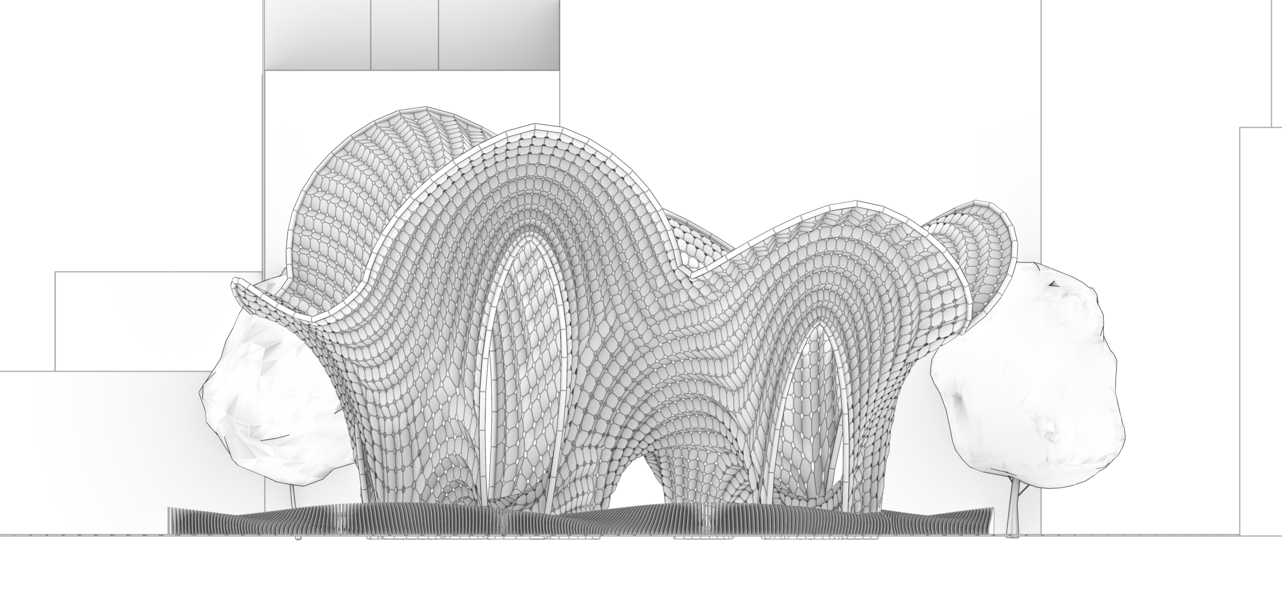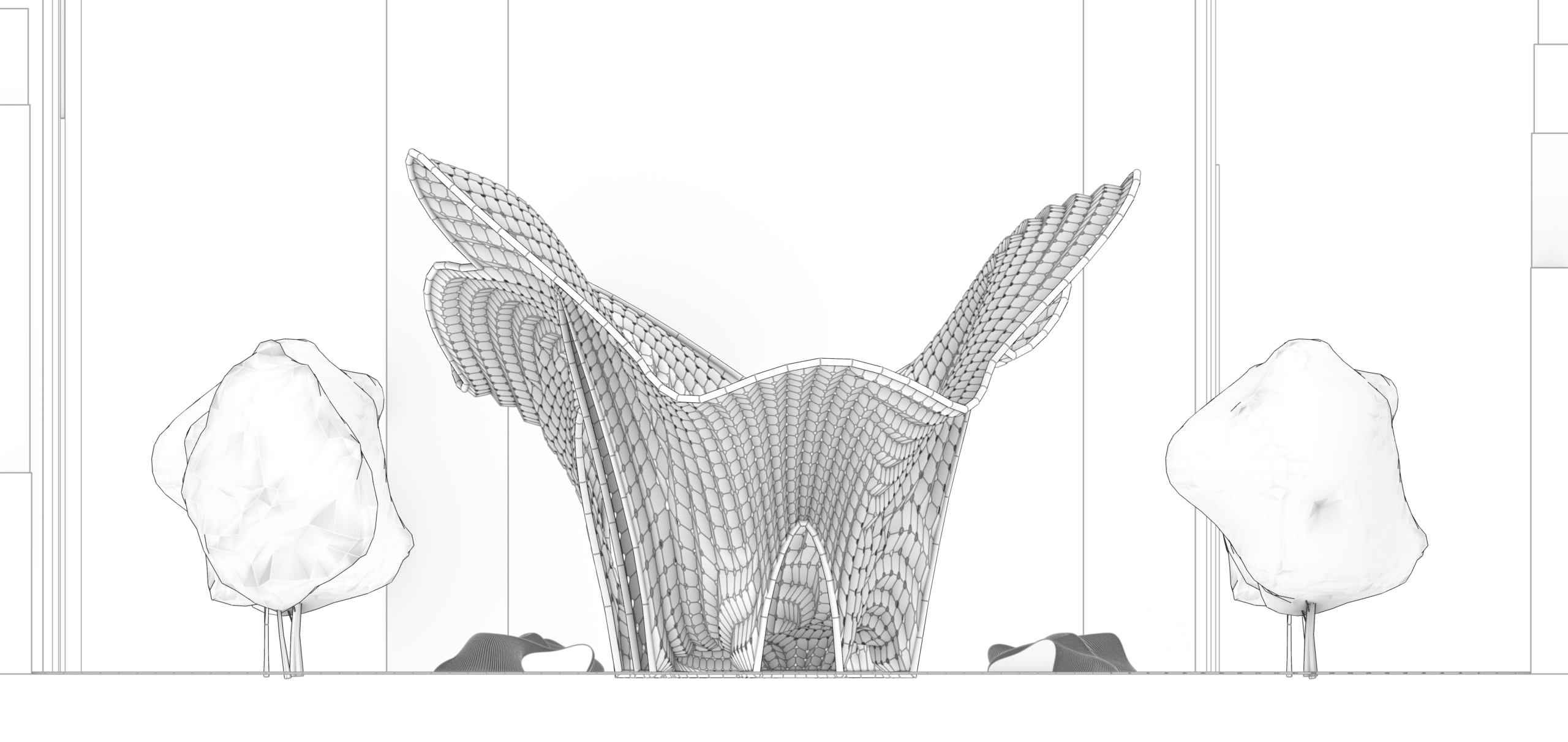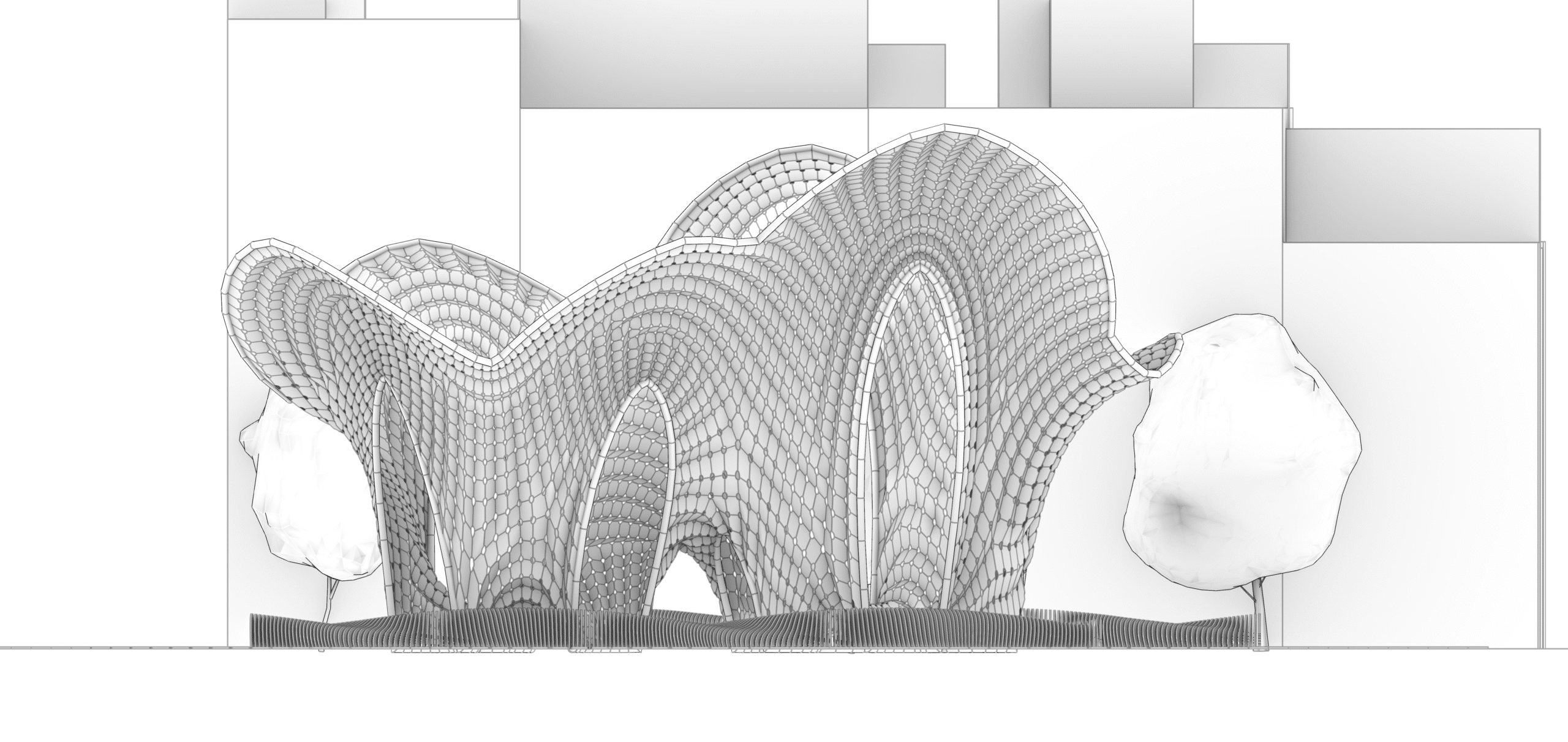 The structural elevation relies on a physics simulation engine. The planar grid is subjected to opposing force vectors: a constant upward thrust and the rigid tethering of the bottom supports, thereby generating double-curved vaults.