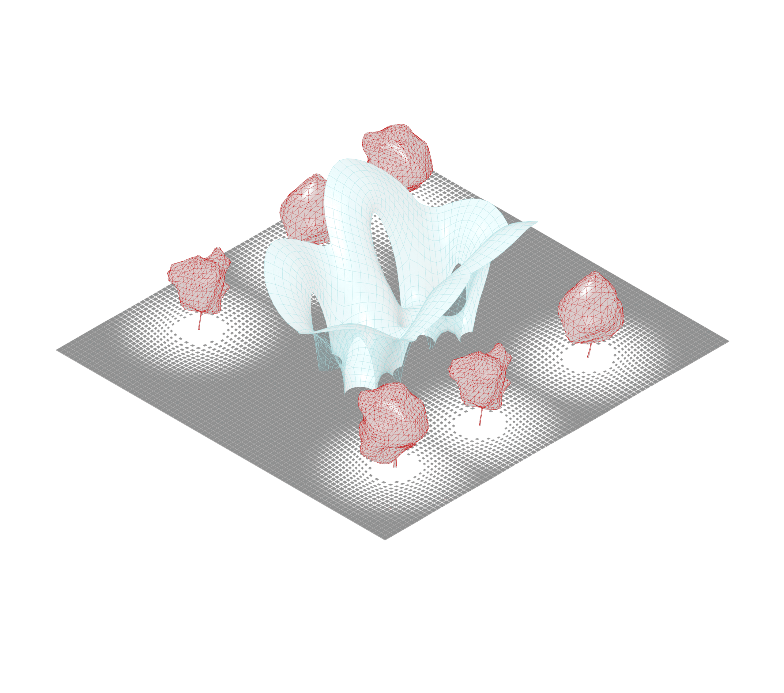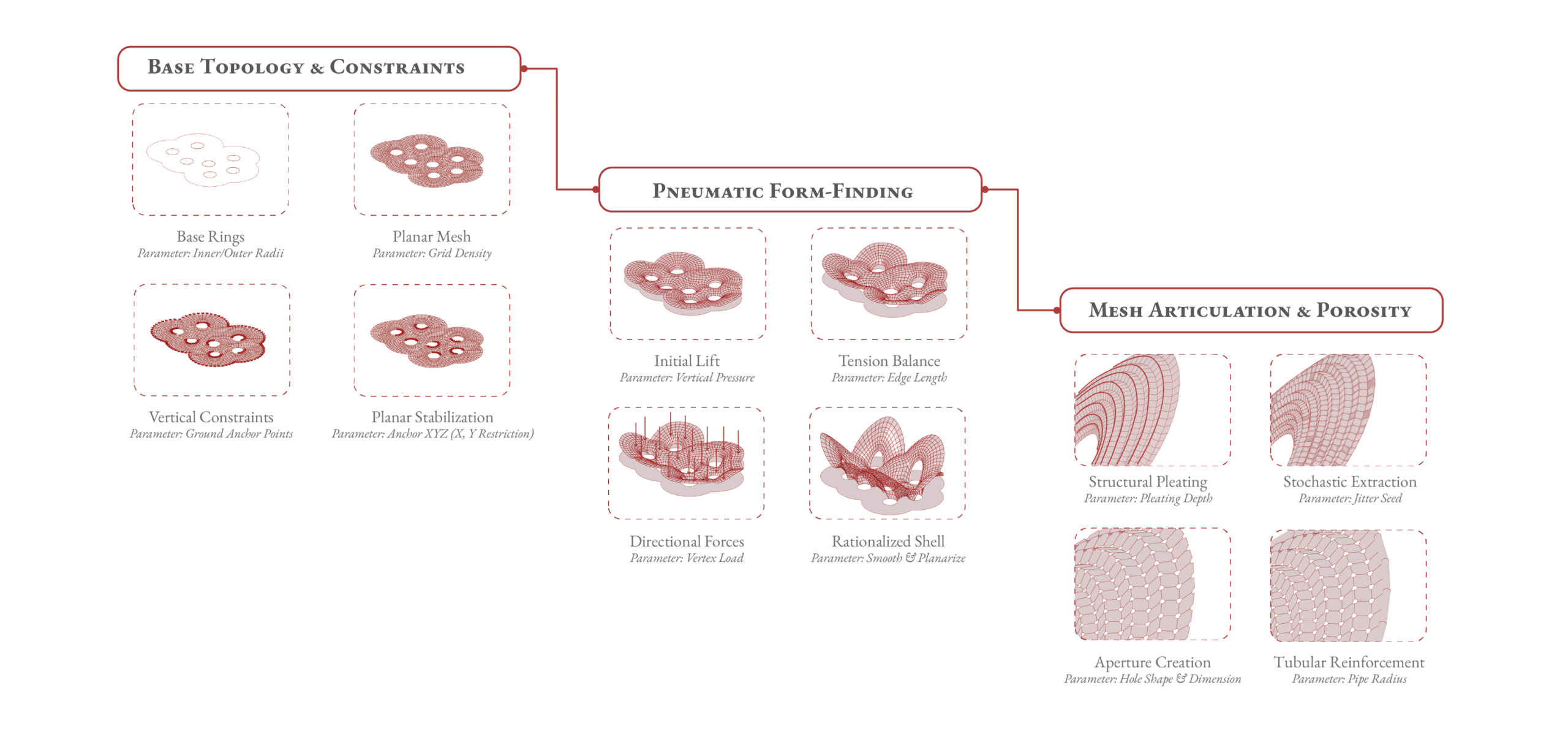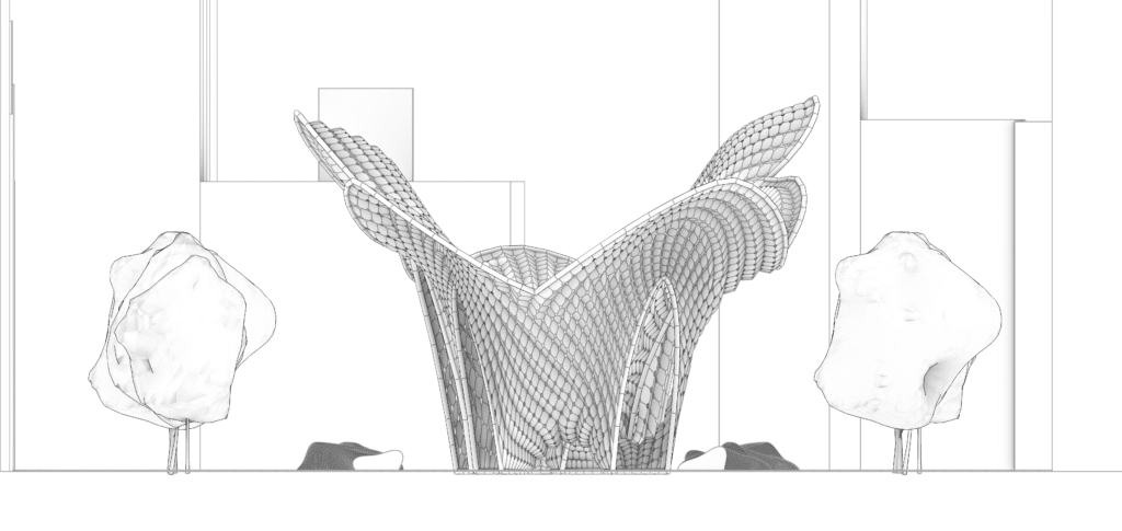The macro-logic employs physics simulations to transform a planar 2D network of lines into a 3D morphology. By manipulating forces as design parameters, an upward pneumatic “inflation” expands the digital grid, while static anchor points constrain the mesh at ground level, naturally generating the hollow pillars.