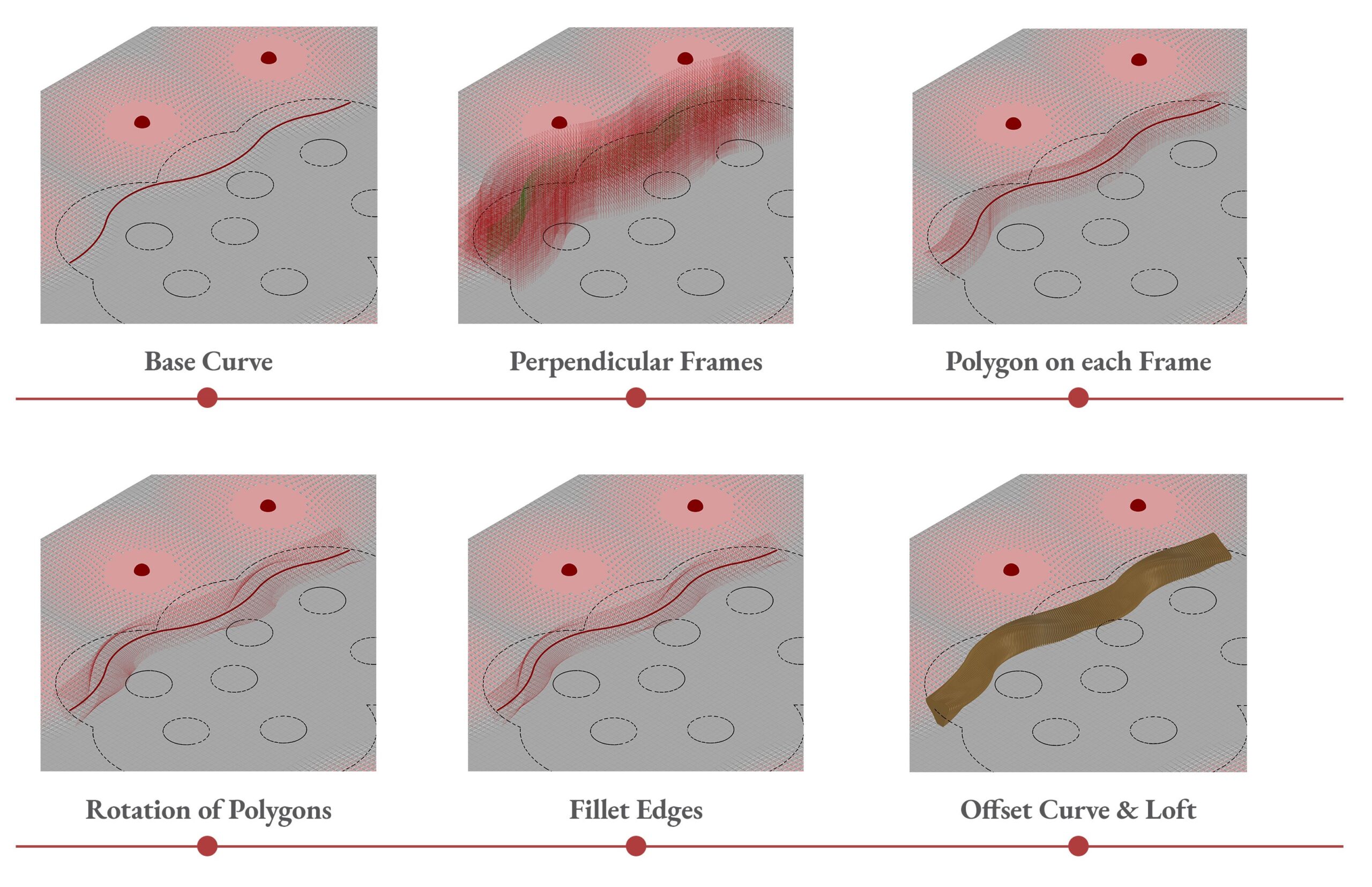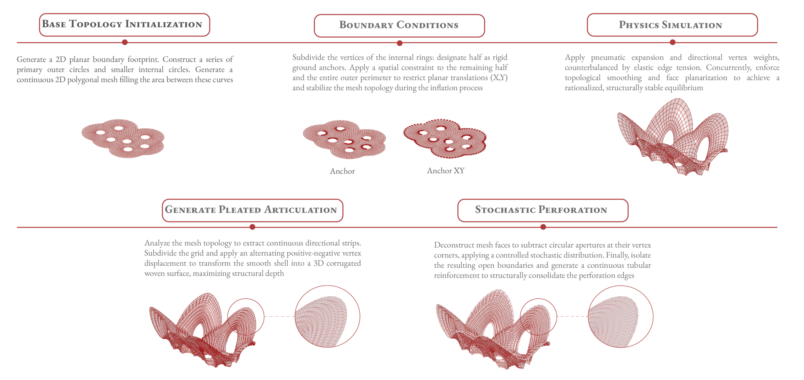 The generative workflow has been decomposed into sequential computational stages. Each logical block is governed by specific mathematical and physical variables that dictate the final three-dimensional output.