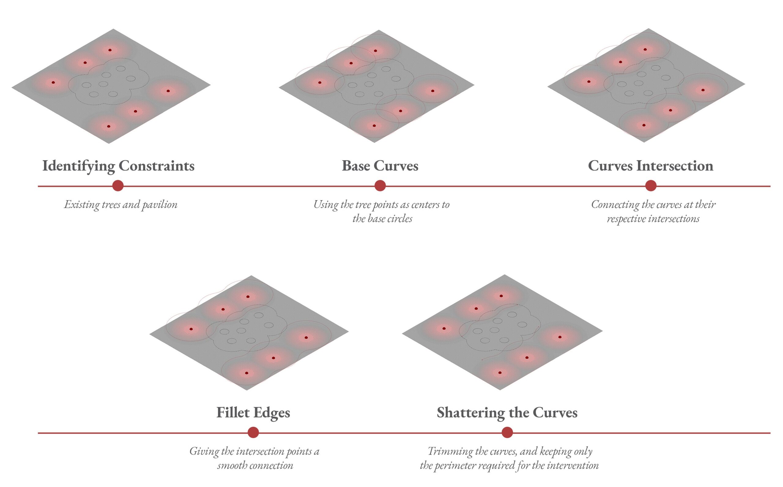 Controlling parameters: spatial coordinates of the centers, magnitude of outer and inner radii, and the subdivision density of the starting polygonal network.