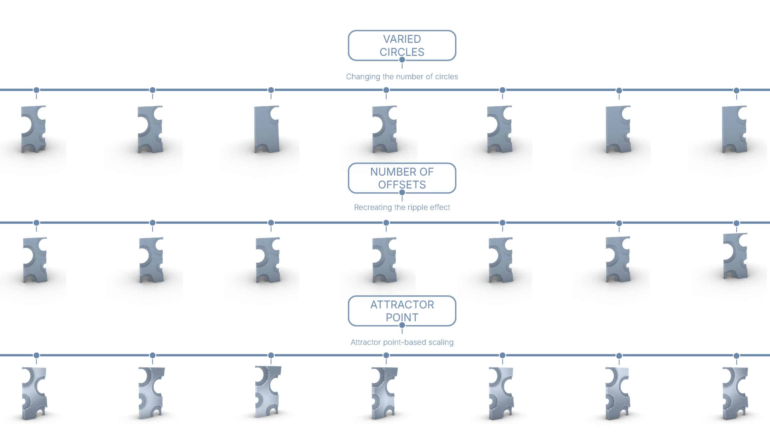 We initiated the form-finding process by generating a series of circles with randomized diameters. These were then iteratively offset to create concentric rings, replicating the ‘repeating’ ripple effect of the reference. To further articulate the geometry and introduce complexity, we applied a projected grid texture to the surface, allowing us to rationalize the form. The entire system is governed by an attractor point strategy, which acts as the primary driver for the design, dynamically controlling the distribution, scale, and deformation of the facade elements.