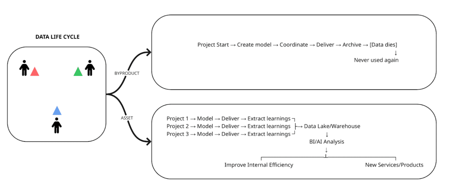 Compounding this issue is the vast amount of data generated within BIM files that remains untapped. This data is typically seen as a by-product of the modelling process rather than a strategic asset that could improve company processes, inform decision-making, and enable new services and business offerings. We find ourselves at a crossroads: how do we move from coordination to genuine collaboration, and how do we shift our perspective on data from by-product to asset?