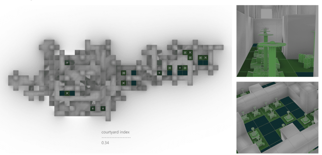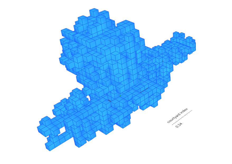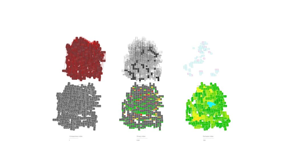 This evaluation produces an index measuring the proportion of enclosed void space relative to the total assemblage mass. These voids are classified by horizontal enclosure and vertical openness, identifying potential for typologies such as courtyards, terraces, and internal open spaces that support social, spatial, and environmental functions.