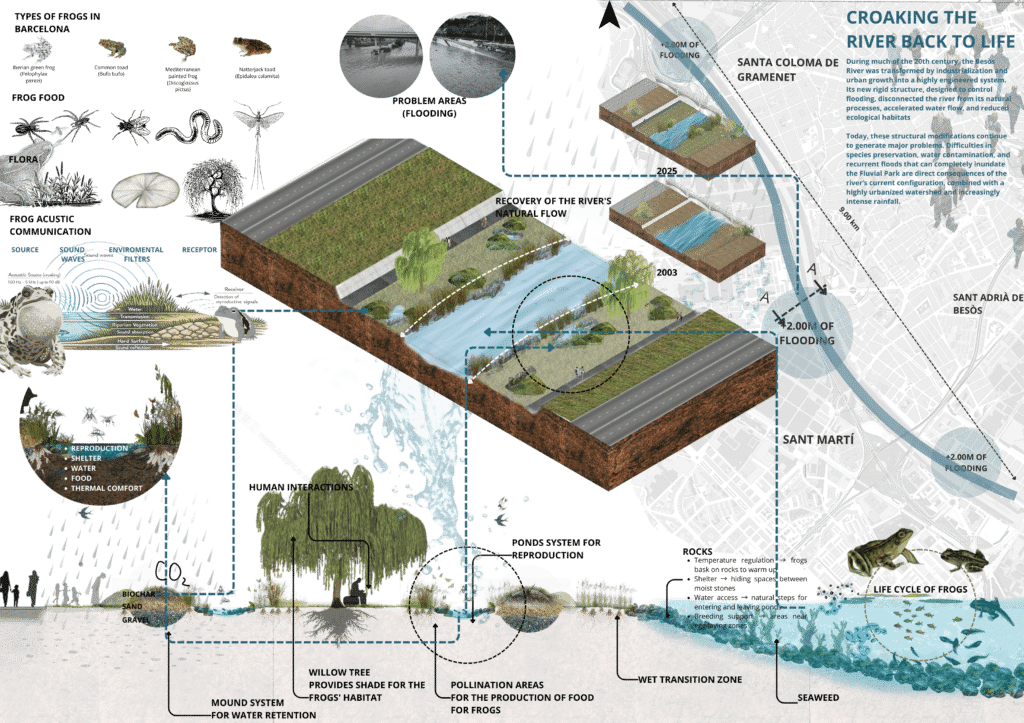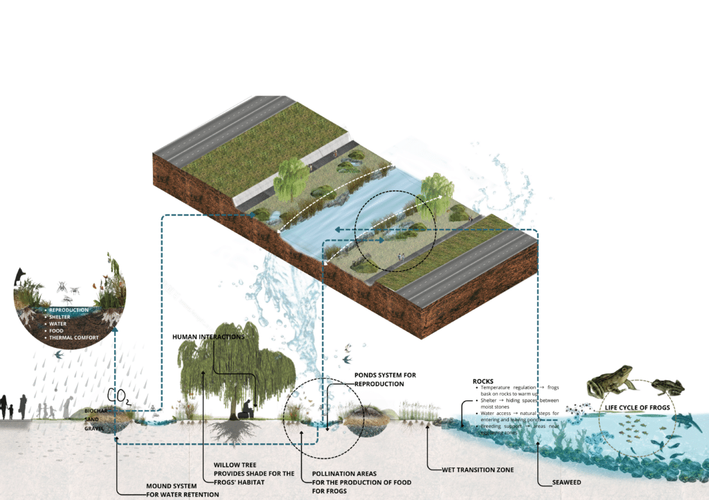 El proyecto diseña una infraestructura ecológica integrada que recrea las condiciones necesarias para la vida y reproducción de los anfibios en el ecotono río-ciudad. A través de un corte de terreno, el diagrama muestra cómo el agua, la vegetación, el suelo y la topografía interactúan para formar un hábitat resiliente.