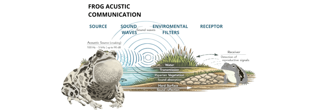 Una rana (rana fuente) emite llamadas que viajan como ondas sonoras a través del agua, el aire y la vegetación. El paisaje actúa como filtro: el agua transmite el sonido, las plantas lo absorben y las superficies duras lo reflejan. Si otra rana (rana receptora) detecta claramente la señal, significa que el hábitat permite la comunicación reproductiva y, por lo tanto, es adecuado para la especie.