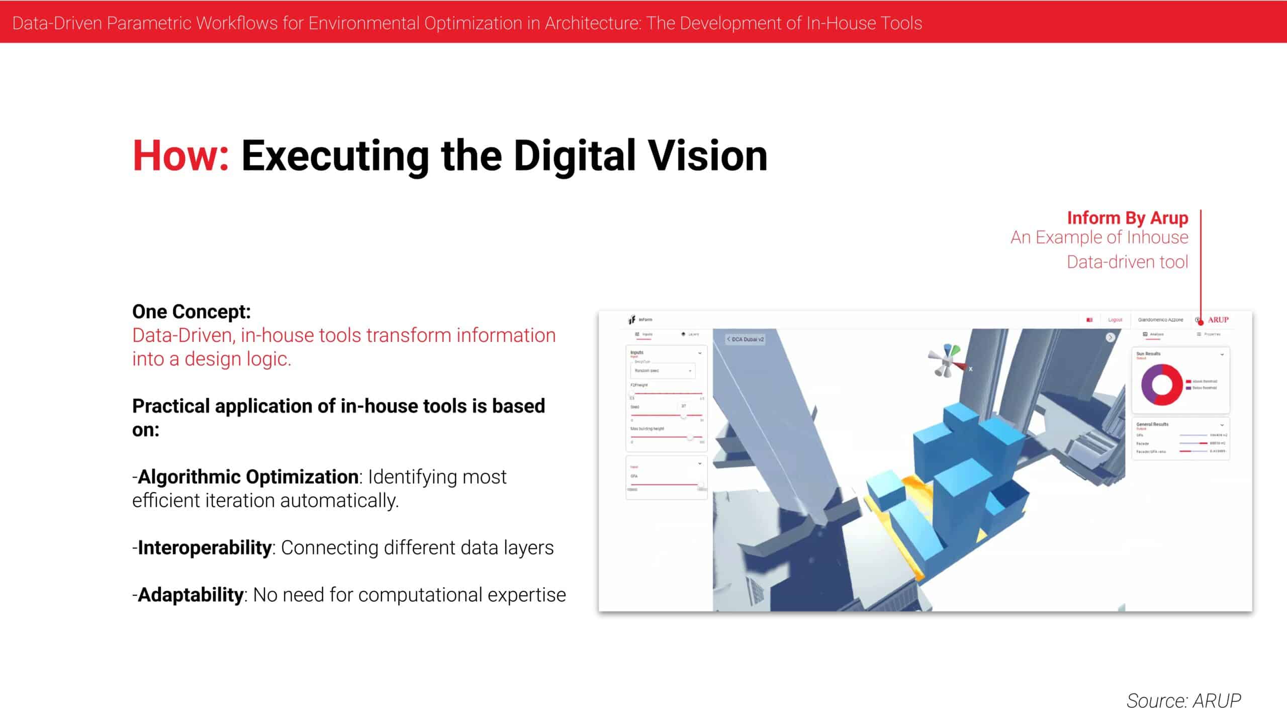 Yes, very good question. First of all, I think we are living in interesting and challenging times. Interesting because we are living in a time where digital and AI are coming up and computational design, but challenging also because cities are growing and expanding and we are dealing with densification, more complex projects. We need to think about questions like comfort, sustainability and climate resilience. So both interesting and challenging. And this is where we think computational design can change things. By exploring different designs in the early stage, we can include all of these metrics from the start and therefore help our clients de-risk the design process in which we then have included all of these important KPIs from the start. So what tools are we using? We use mainly Grasshopper for early stage in combination with our internally developed platform called Arup InForm.