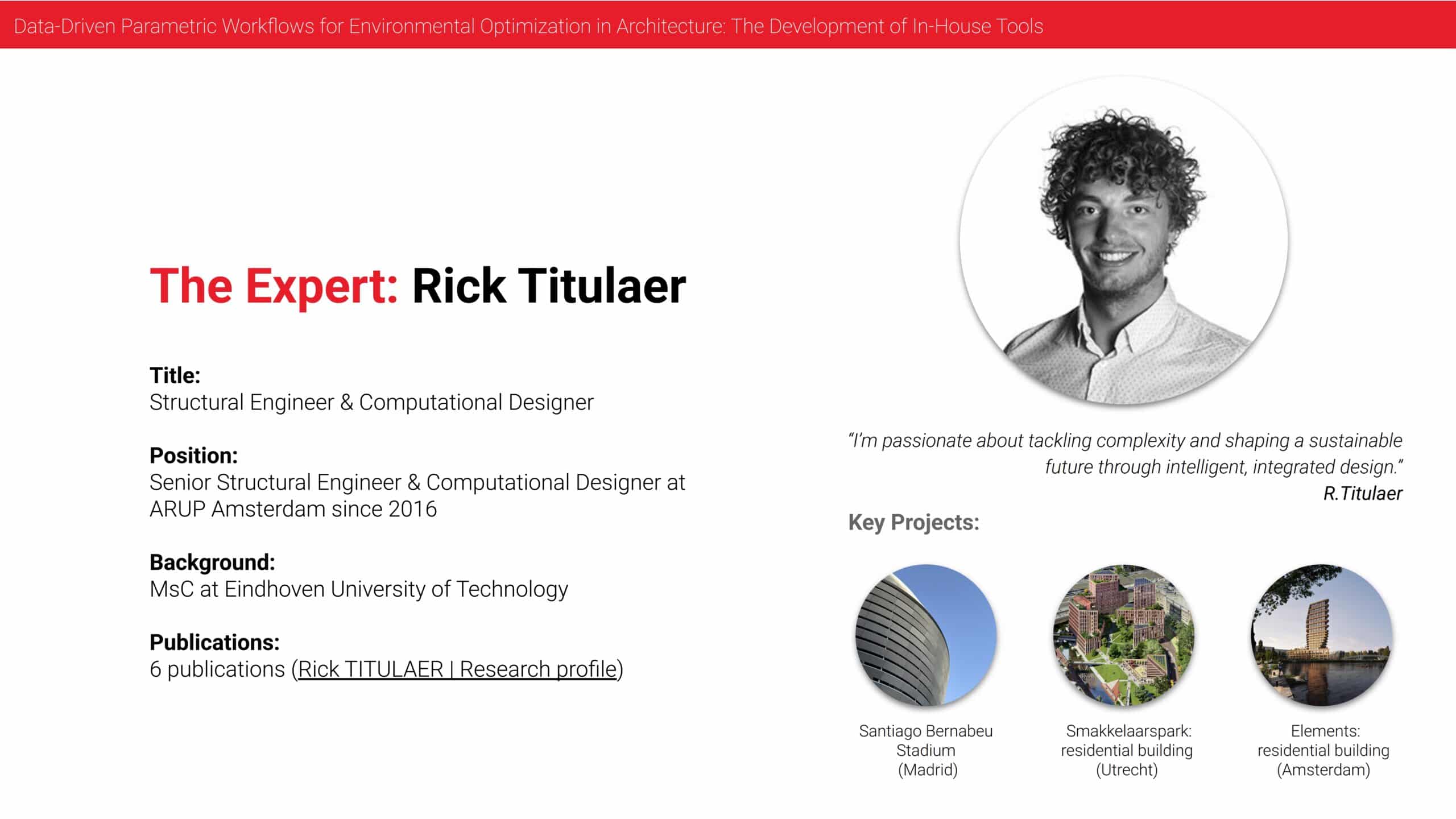Yes, thank you for the introduction. For those who don’t know me, my name is Rick Titulaer. I’m a senior structural engineer and computational designer in Arup in Amsterdam. I was born in the south of the Netherlands. I did my studies in Eindhoven at the Technical University where I studied architecture and the built environment.