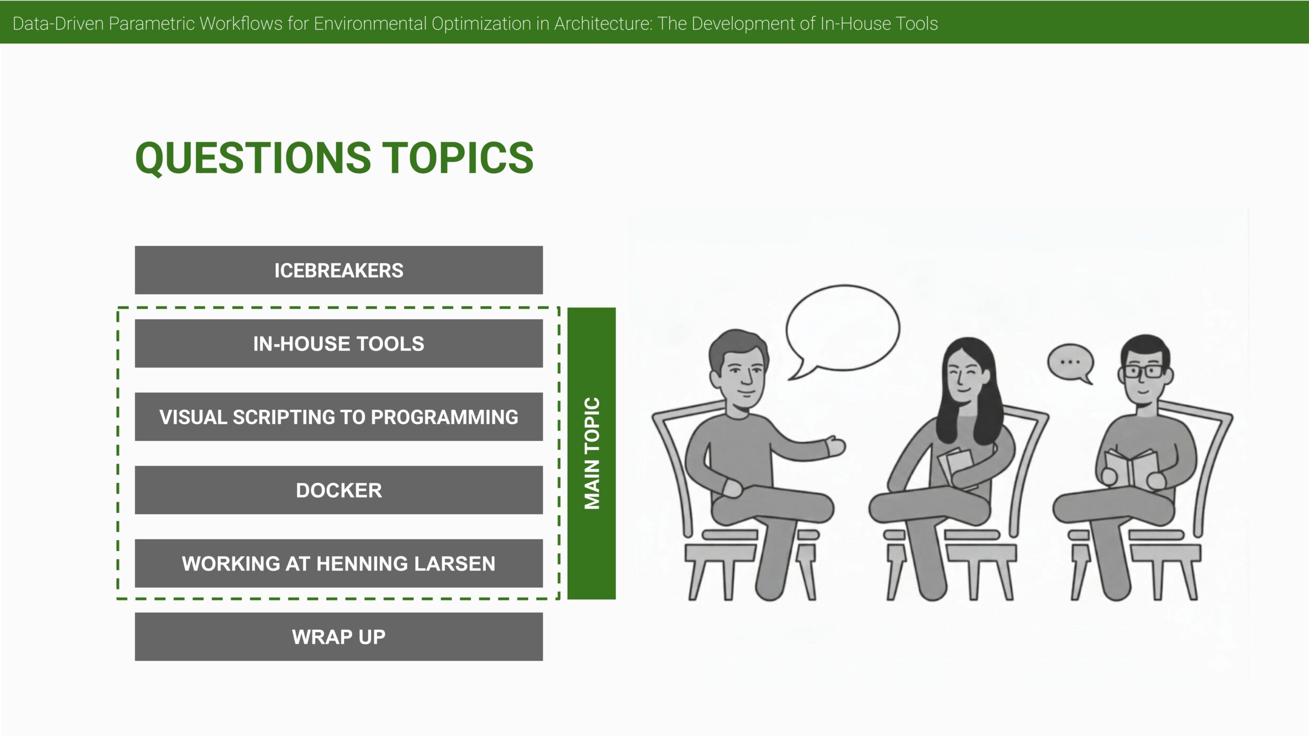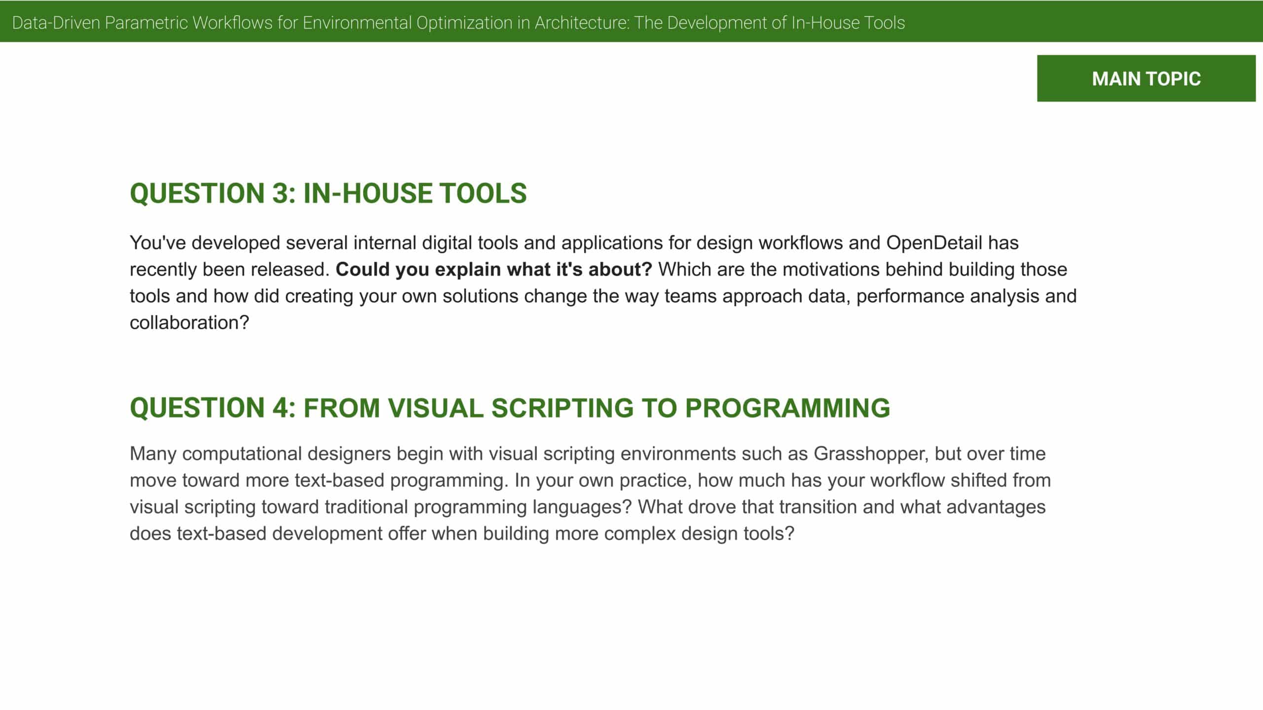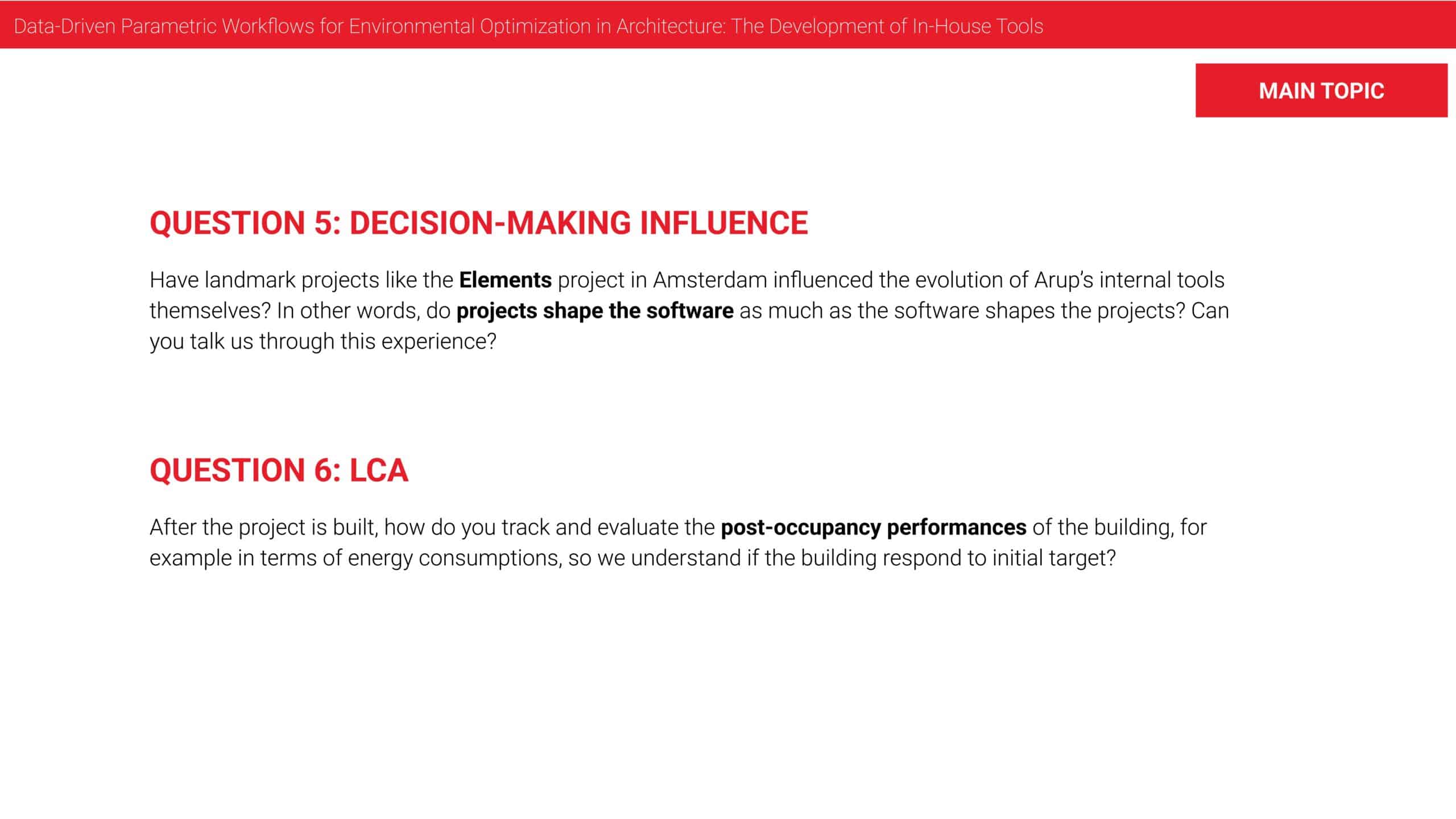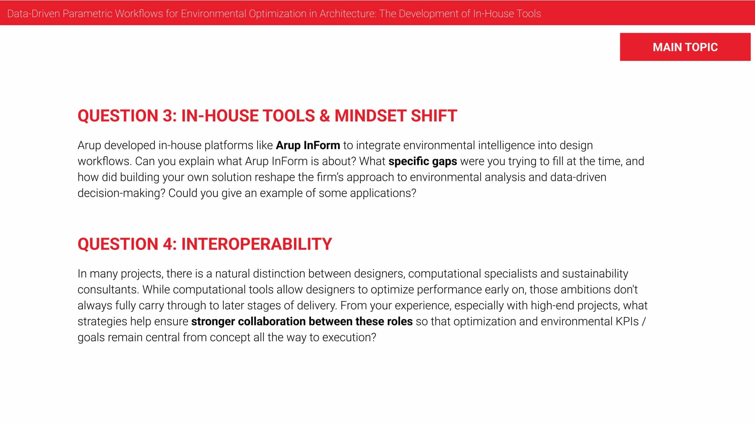And finally, I think also digital interoperability is crucial. So once we have a design coming out of InForm, how can we then push it into Revit or how can we make sure that the results are tracked throughout the design phases. Currently we’re also still facing this challenge. That’s a very hard thing, I guess.