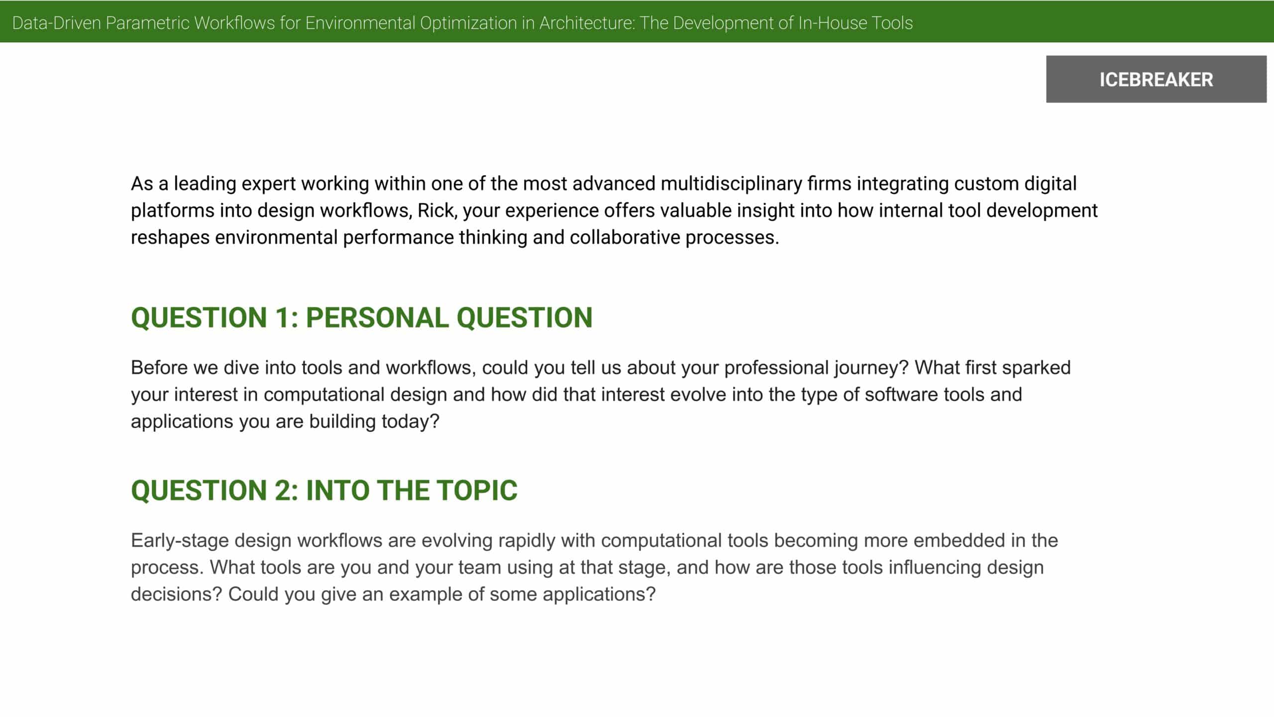 For our next question. So Arup, you also talked about the grasshopper integration and the internal in-house platform like the Arup InForm. So can you please explain what is it about? How did building your own solution, probably within Grasshopper or within the software itself, can reshape the firm’s approach to environmental analysis and data-driven decision-making?