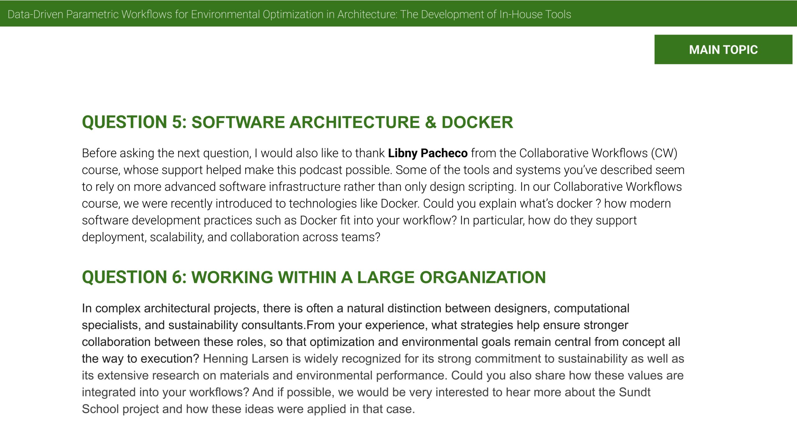 Yeah, this is a very good question. And I think this is also the hardest part currently, even for us. So as we do many early stage projects, they often continue in a very traditional way after we’ve set sort of the rules. I think a key strategy to help ensure stronger collaboration, in our opinion, could be total design.