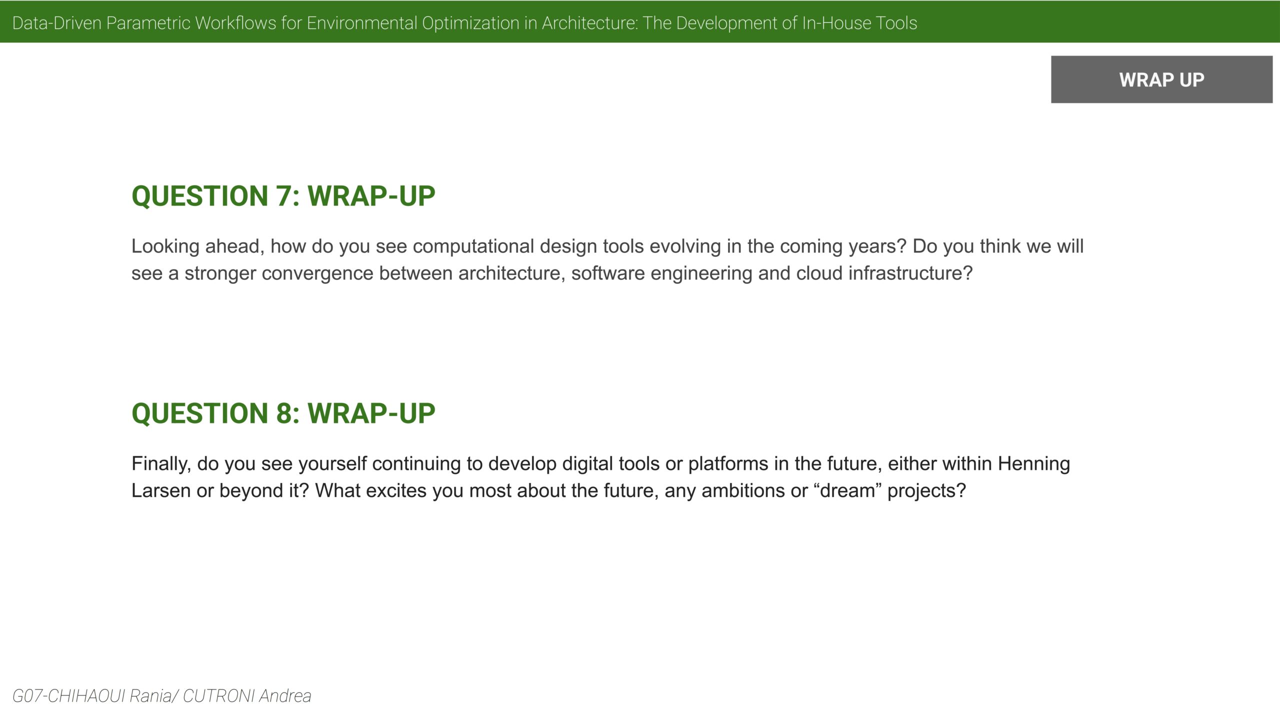 That helping of developing digital tools will be internal like Inform or external by developing plugins. I think the goal will be the same to enable better decision making in the design process. And then to answer your second question about my dreams. I think…