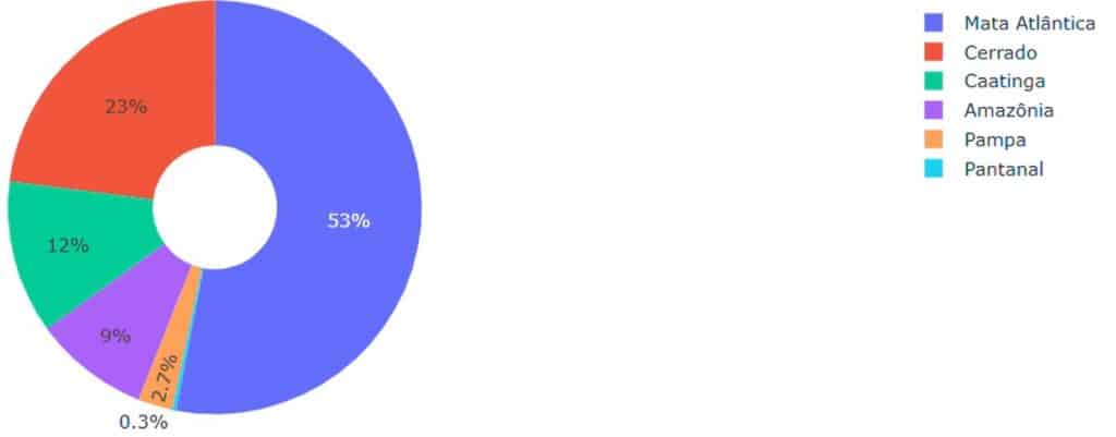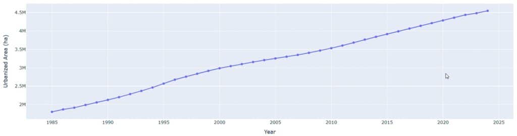 The visualization shows the expansion of urbanized areas in Brazil in 2024, highlighting where new urban growth has occurred. The time series from 4985 to 2024 reveals a steady and continuous increase in urban extent, rising from under 2 million hectares to more than 4 million hectares. The ranking of biomes indicates that the Atlantic Forest leads urban expansion with over 2.3 million hectares, followed by the Cerrado and Caatinga. These patterns reflect long-term demographic and infrastructural trends, illustrating how urbanization reshapes landscapes and emphasizing the need for planning strategies that balance development and