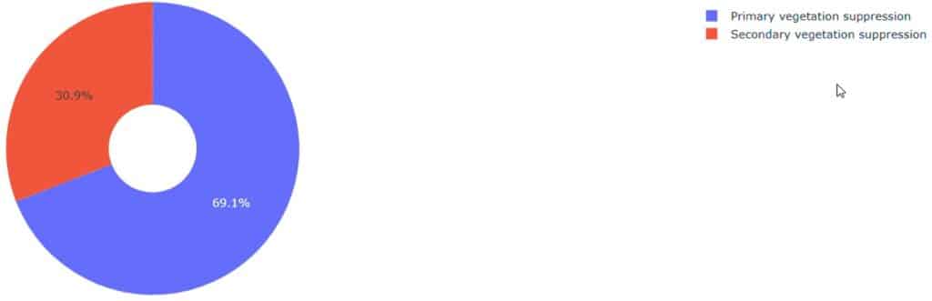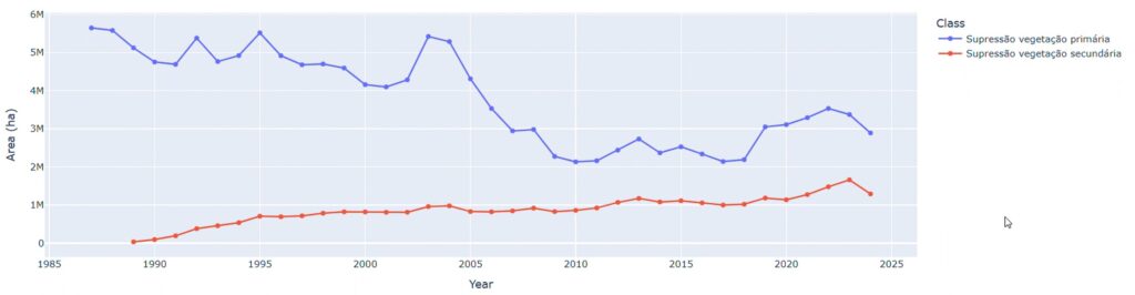 The visualization depicts accumulated and annual deforestation patterns in Brazil from 1985 to 2024. The accumulated dataset shows a continuous rise in total deforested areas, reaching over 140 milllion hectares. Annual trends reveal strong fluctuations, with peaks in the late 1980’s and mid-2000’s, followed by decreases and renewed variability in recent years. In 2024, primary vegetation supression accounts for 69.1% of total deforestation, while secondary vegetation represents 30.9%. These patterns highlight long-term pressures on natural ecosystems, demonstrating how persistent land conversion shapes landscapes and emphasizing the urgency of conservation and sustainable land-use policies.