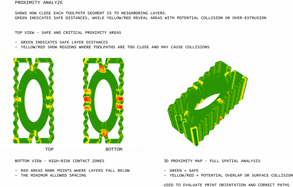 The proximity analysis evaluates toolpath segment distances to neighboring layers, identifying collision risks and over-extrusion zones through color-coded mapping where green indicates safe layer clearances and yellow/red highlights critical areas where toolpaths fall below minimum spacing thresholds. The top view displays overall safe and critical proximity regions, while the bottom view specifically marks high-risk contact zones where layers may cause collisions. A comprehensive 3D proximity map provides full spatial analysis, visualizing potential overlaps or surface collisions across the entire geometry. This pre-fabrication validation tool enables print orientation optimization and toolpath correction, ensuring collision-free execution in robotic additive manufacturing workflows.
