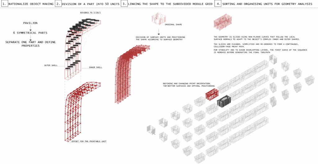The workflow begins by rationalizing the pavilion structure into 6 symmetrical parts, isolating one section to define properties for both outer and inner shell systems, establishing the printable unit as the fundamental module. The isolated section undergoes surface-based subdivision into 50 modular units, with division following surface geometry and topology to maintain geometric continuity. The geometry is then sliced using non-planar curves that follow local surface normals, adapting to complex inner and outer contours, with slices cleaned, simplified, and re-ordered to form collision-free print paths through multiple overlapping layers where the first curve defines the subsequent layer sequence via the final toolpath, while top/bottom surfaces receive optimal positioning. Finally, all units are systematically sorted and organized for production sequencing, enabling comprehensive geometric analysis pre-fabrication to ensure manufacturing efficiency and quality control in robotic additive manufacturing execution.