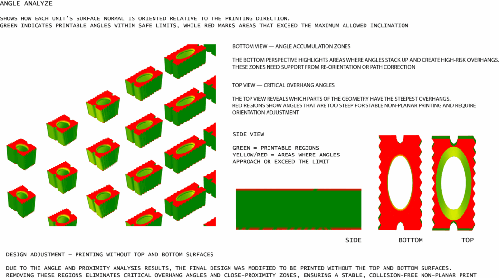 The angle analysis evaluates each unit’s surface normal orientation relative to the printing direction, using color-coded mapping where green indicates printable angles within safe limits and red marks areas exceeding maximum allowed inclination. The bottom view displays angle accumulation zones, highlighting areas where angles stack up and create high-risk overhangs that require support or re-orientation for path correction. The top view reveals critical overhang angles, identifying which parts of the geometry have the steepest inclinations where red regions show angles too steep for stable non-planar printing and require orientation adjustment. Side view analysis shows printable regions in green while yellow/red areas indicate where angles approach or exceed the limit threshold. Based on angle and proximity analysis results, the final design was modified to be printed without top and bottom surfaces, removing these regions to eliminate critical overhang angles and close-proximity zones, ensuring a stable, collision-free non-planar print execution.