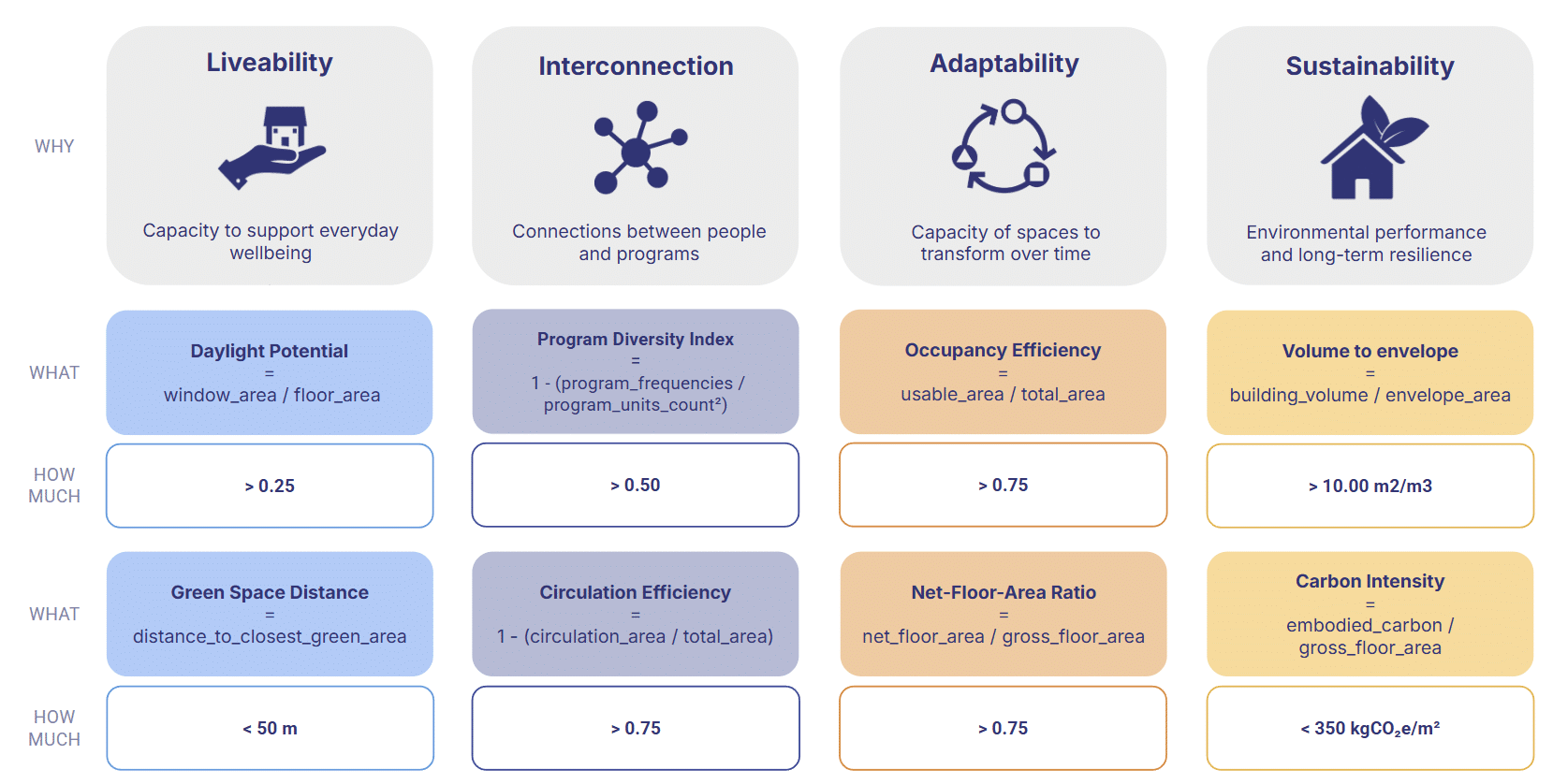 Defining these KPIs was not a one‑time decision but an iterative process. Throughout the trimester, we continuously refined each metric to ensure two things: that it could be measured reliably without time‑consuming simulations or guesswork, and that it remained meaningful within the narrative of the hyperbuilding. This back‑and‑forth allowed us to filter out indicators that were too abstract, too slow to compute, or too detached from design intent, leaving only metrics that were both actionable and aligned with the studio’s goals.