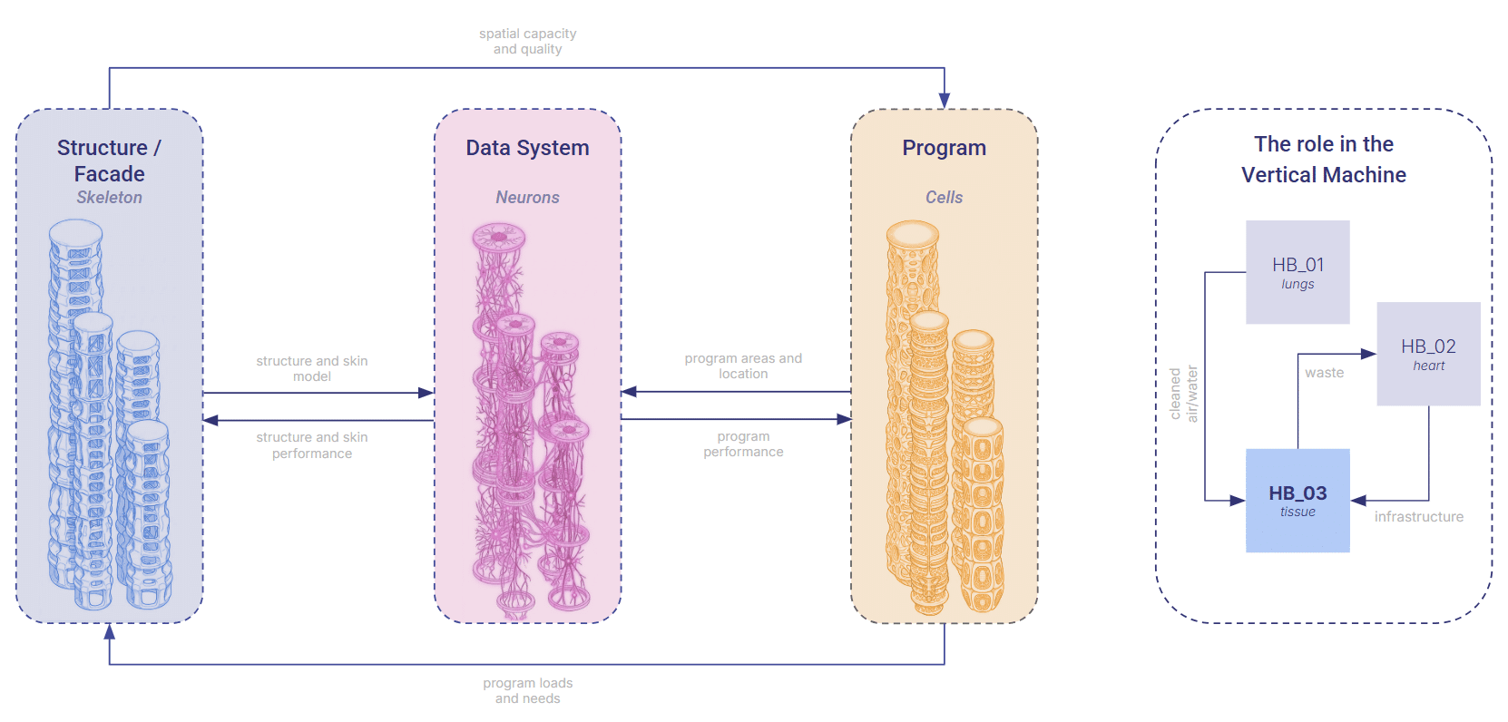 In this metaphor, the structure and façade form the skeleton, the program behaves like living cells, and the data systems act as neurons, constantly firing: geometry in, performance out. Hyperbuilding 3 sits inside this network like a vital organ, receiving clean air, water, and services from its neighbors, and returning the by‑products of occupation back into the system. It is alive because it is connected.