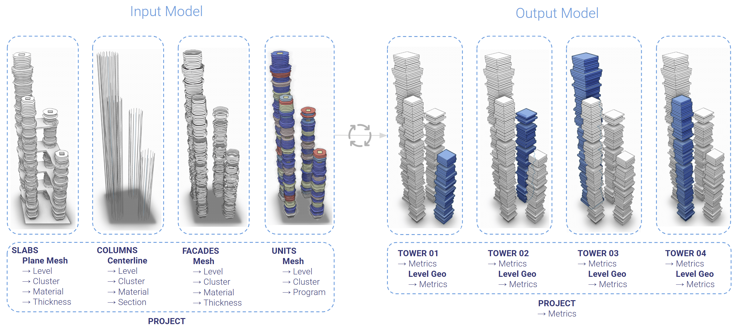 We start from a single, standardized input model containing structure, façades, and units. From this, we derive all metrics at project, tower, and floor level, simplifying geometry into clean level‑boxes to keep everything fast and readable.