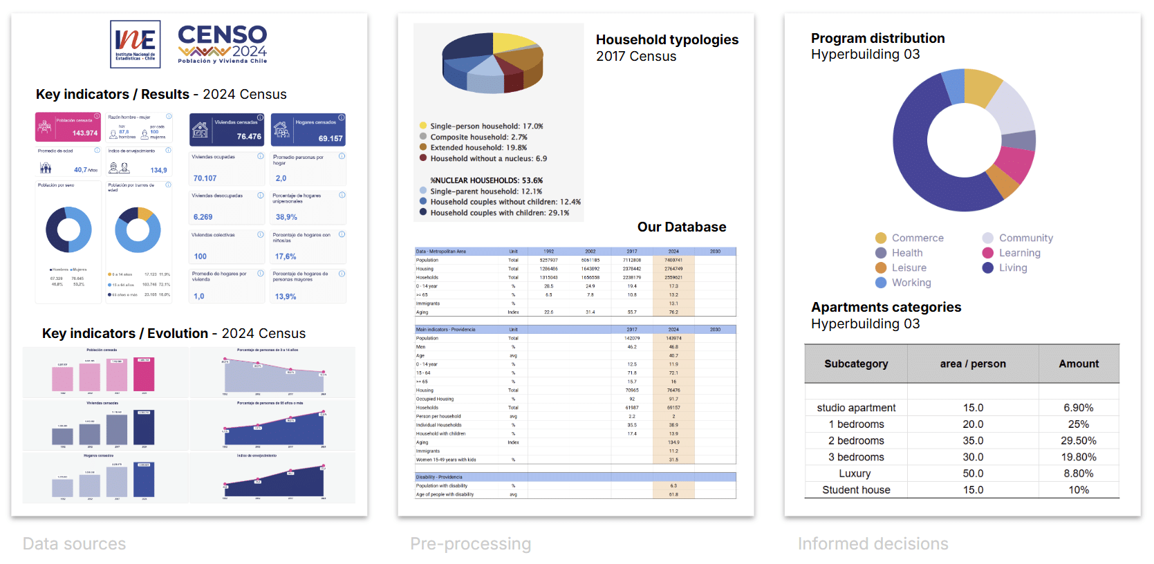 In Hyperbuilding 3, our focus was to understand how demographic data can actively inform architectural decisions. We started by analysing the Chilean census portal, which provides detailed information for the entire metropolitan region and specifically for the Providencia district.