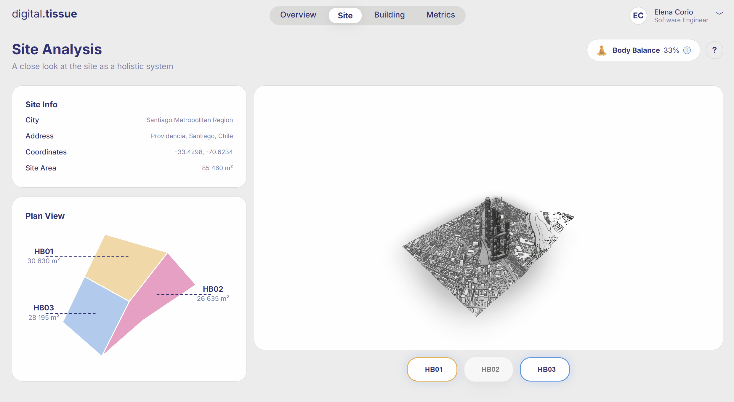 Across all views, the 3D model sits beside the charts, grounding every number in space. The design is minimalistic, calm, and intentional — a visual language that supports clarity rather than noise.