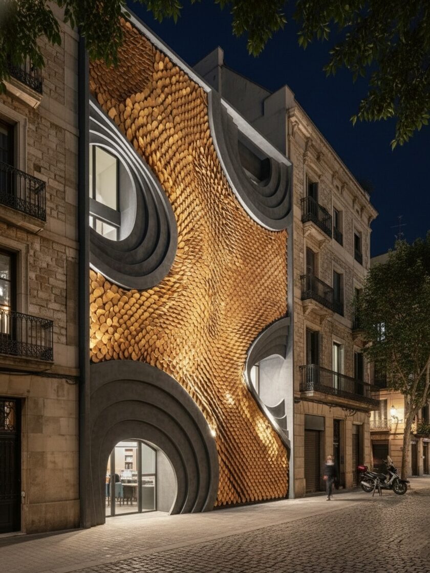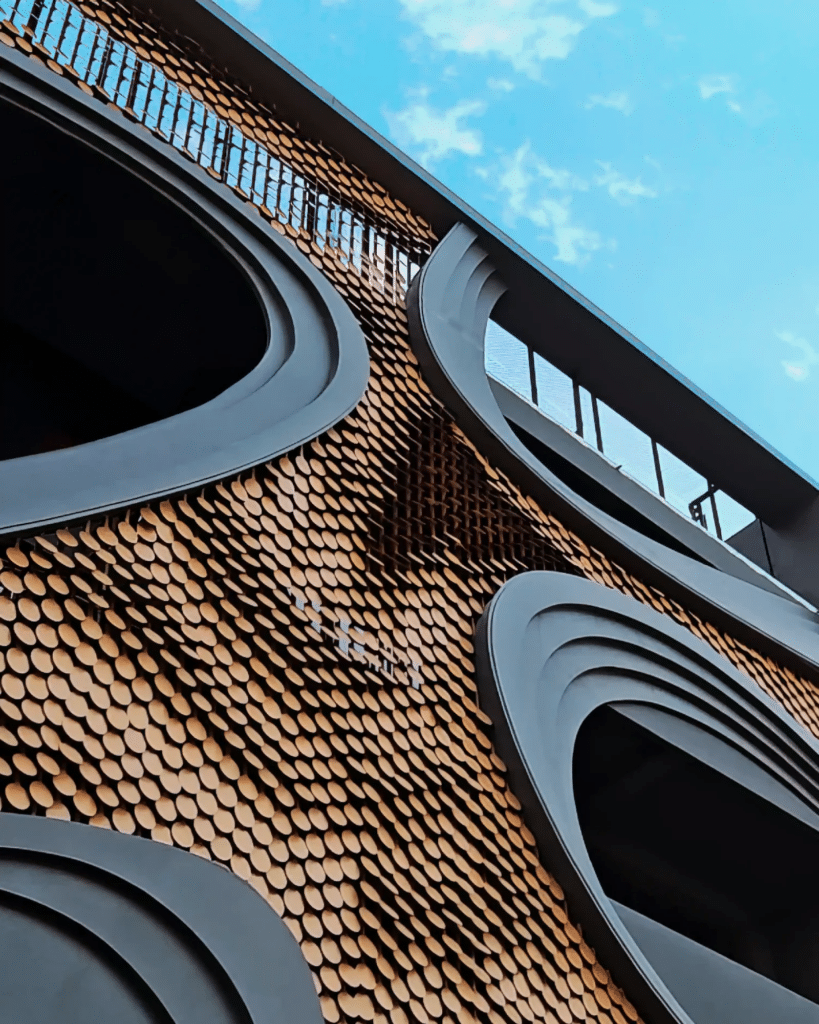 Facade Responds to Light, Wind, and Motion, with its ever-evolving appearance. At the heart of the design is MetaSequin, a modular, reflective parametric façade element. These circular sequins interact with natural forces like wind and light, creating a playful, ever-changing surface that shimmers and transforms throughout the day and night, keeping the façade in constant dialogue with its surroundings.
