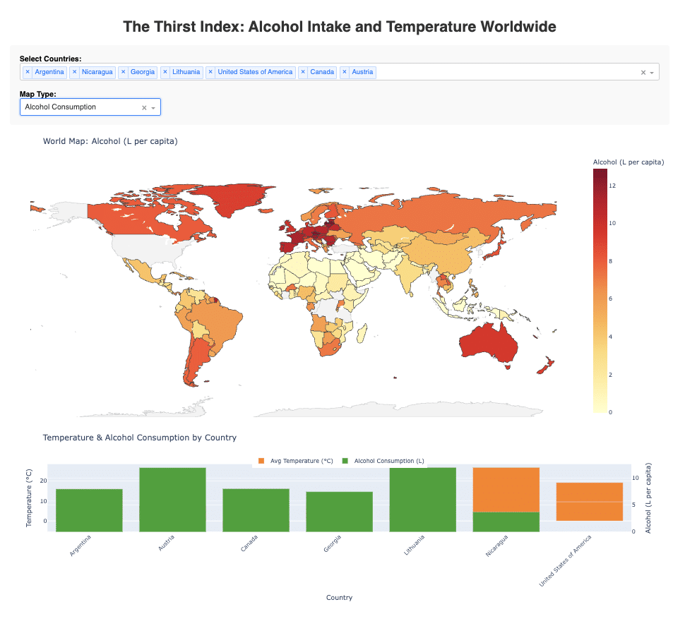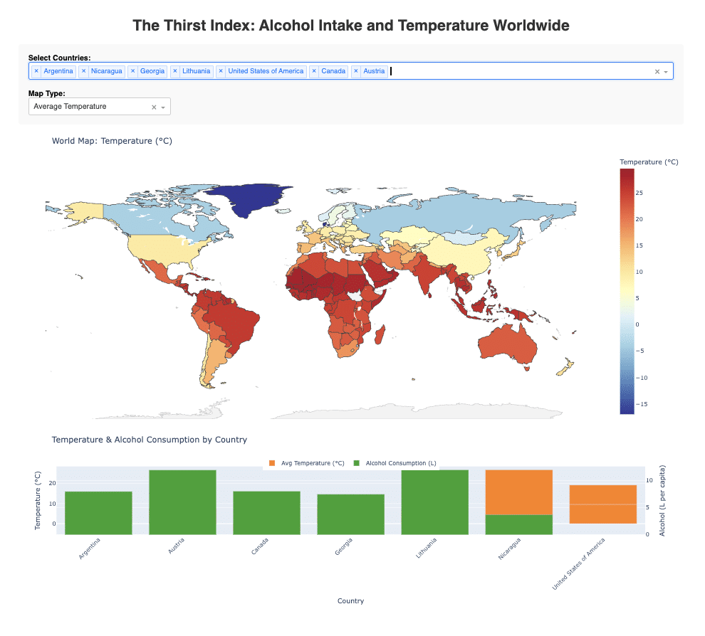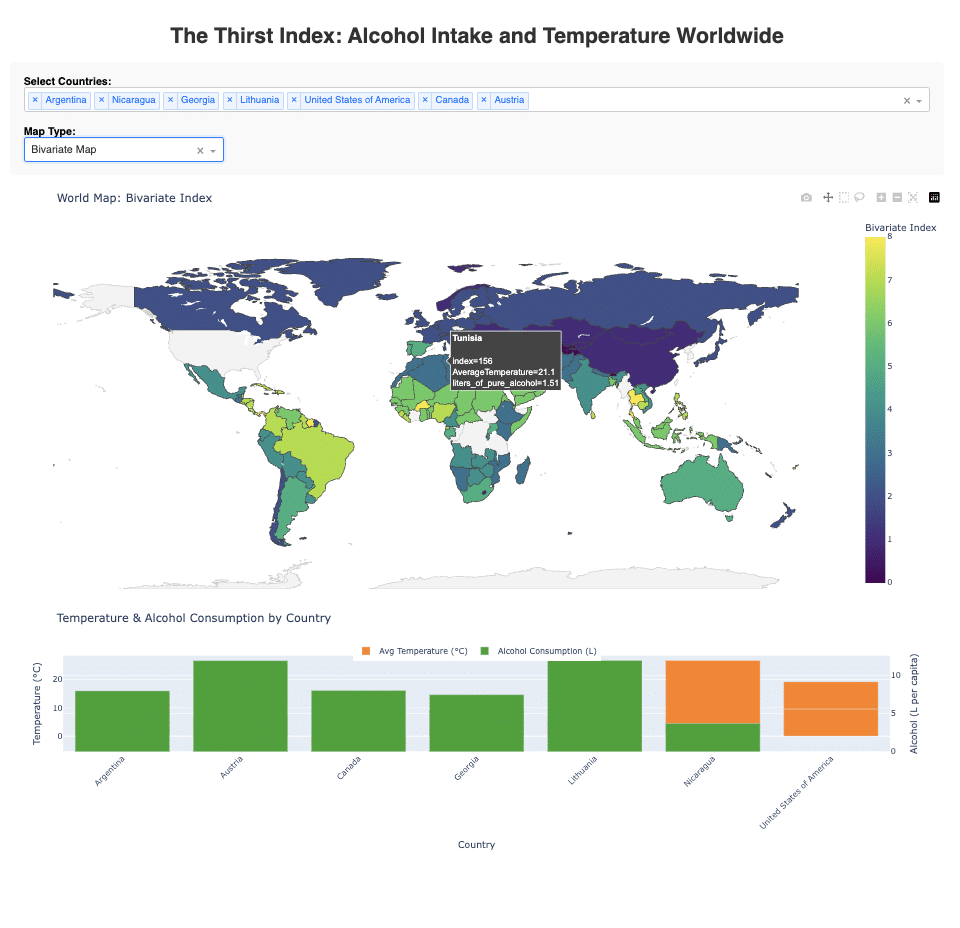 For our first foray into creating this outside of class, we decided to explore datasets that could compare if a country’s average temperature had any correlation with the average citizen’s consumption of alcohol. Our goal was to create several maps showing single data sets, and then to create a final interactive bivariate map; alongside different visual data representations as well. In addition to Dash, we used different python libraries like pandas, geopandas, plotly, shapely, and leafmap. In tandem, these libraries allowed us to clean and merge datasets from different sources and in different formats, export them to csvs and geopackages and then re-upload to our final script being utilized by Dash.