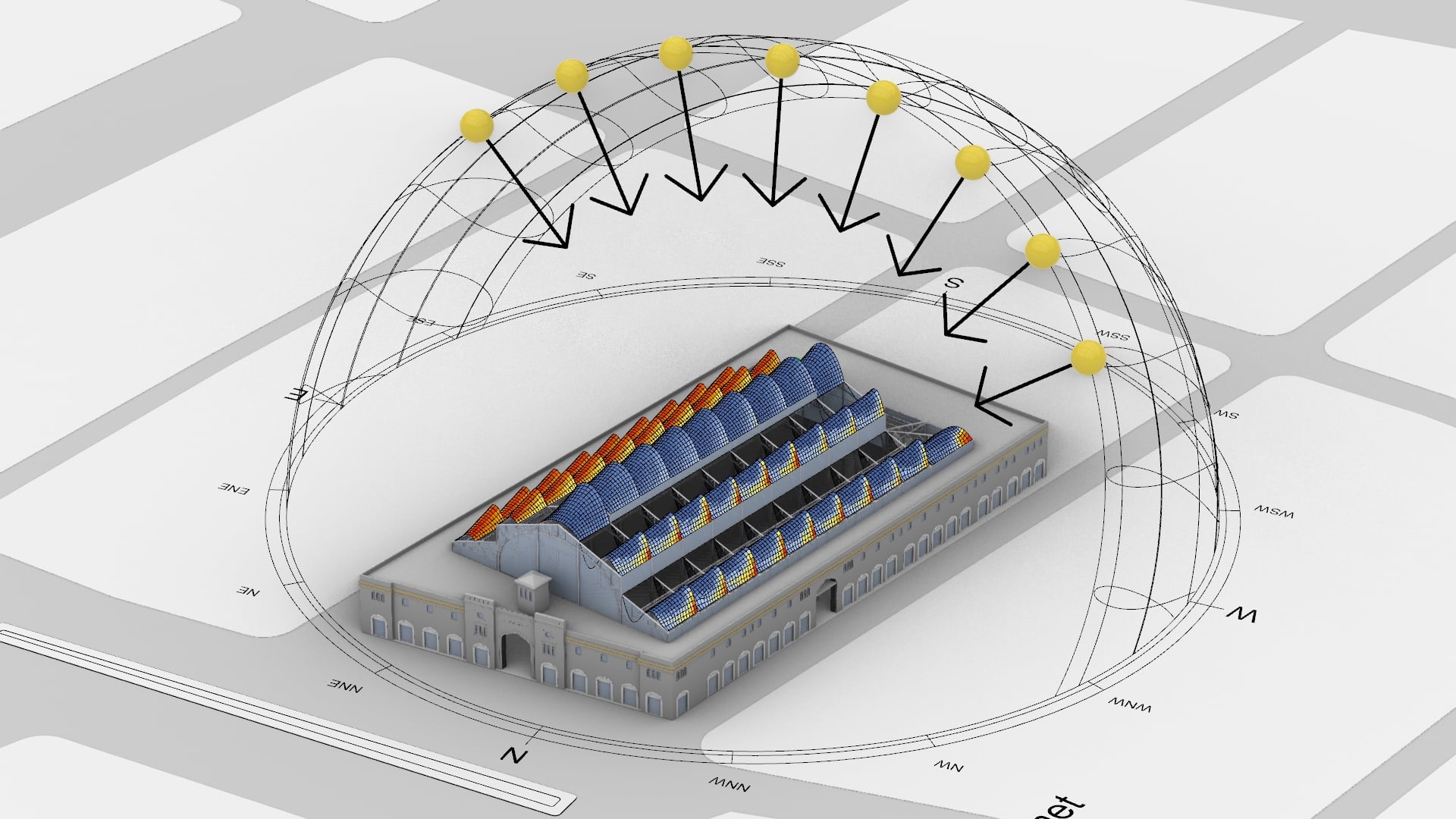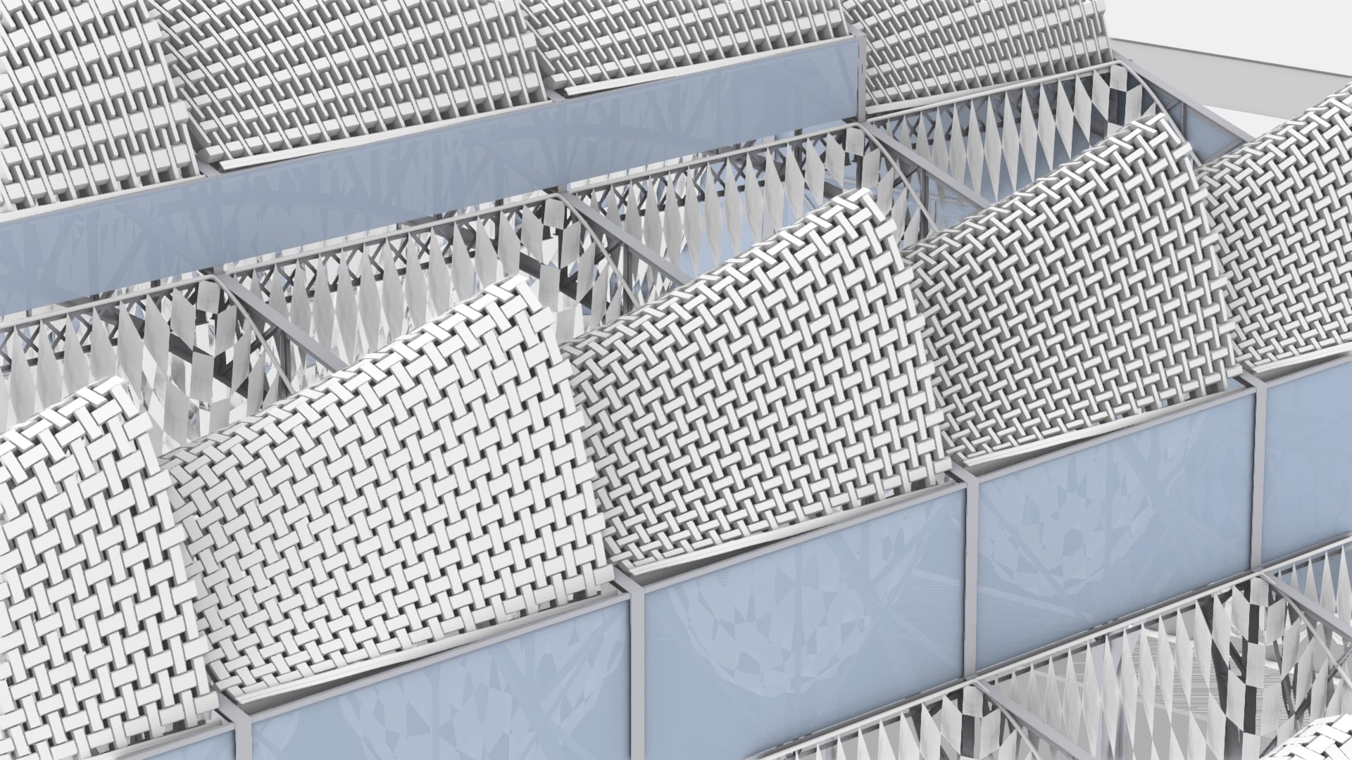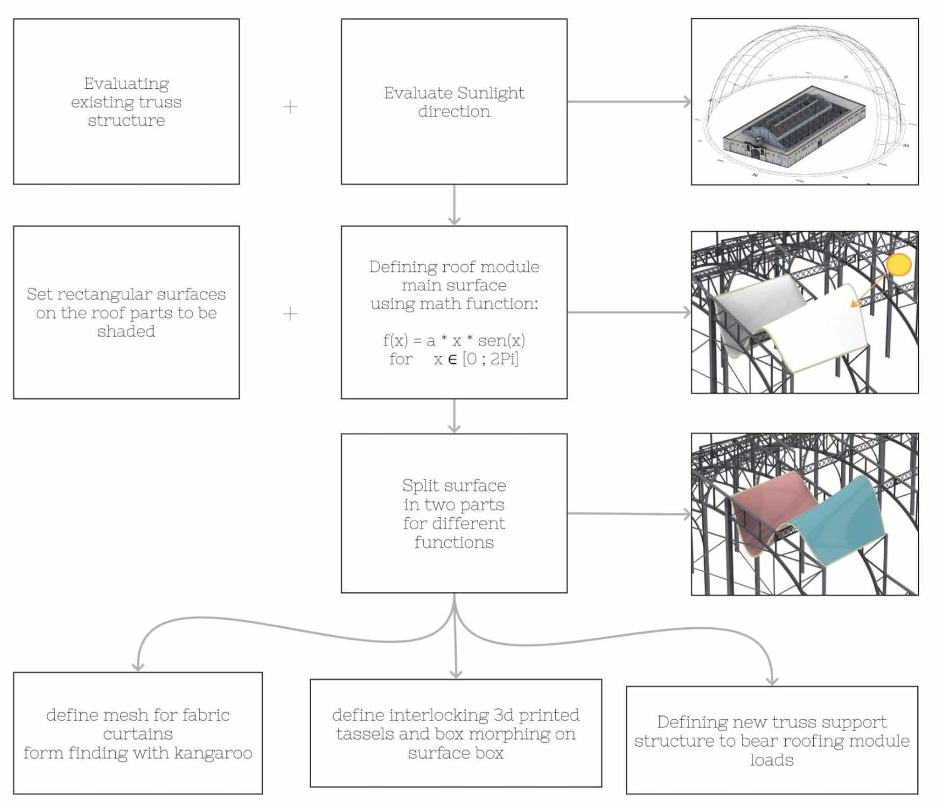 The internal circulation and market layout are directly derived from the roof’s geometry, ensuring a symbiotic relationship between climate control and spatial organization. The disposition of the market stalls is generated through a specific projection workflow: