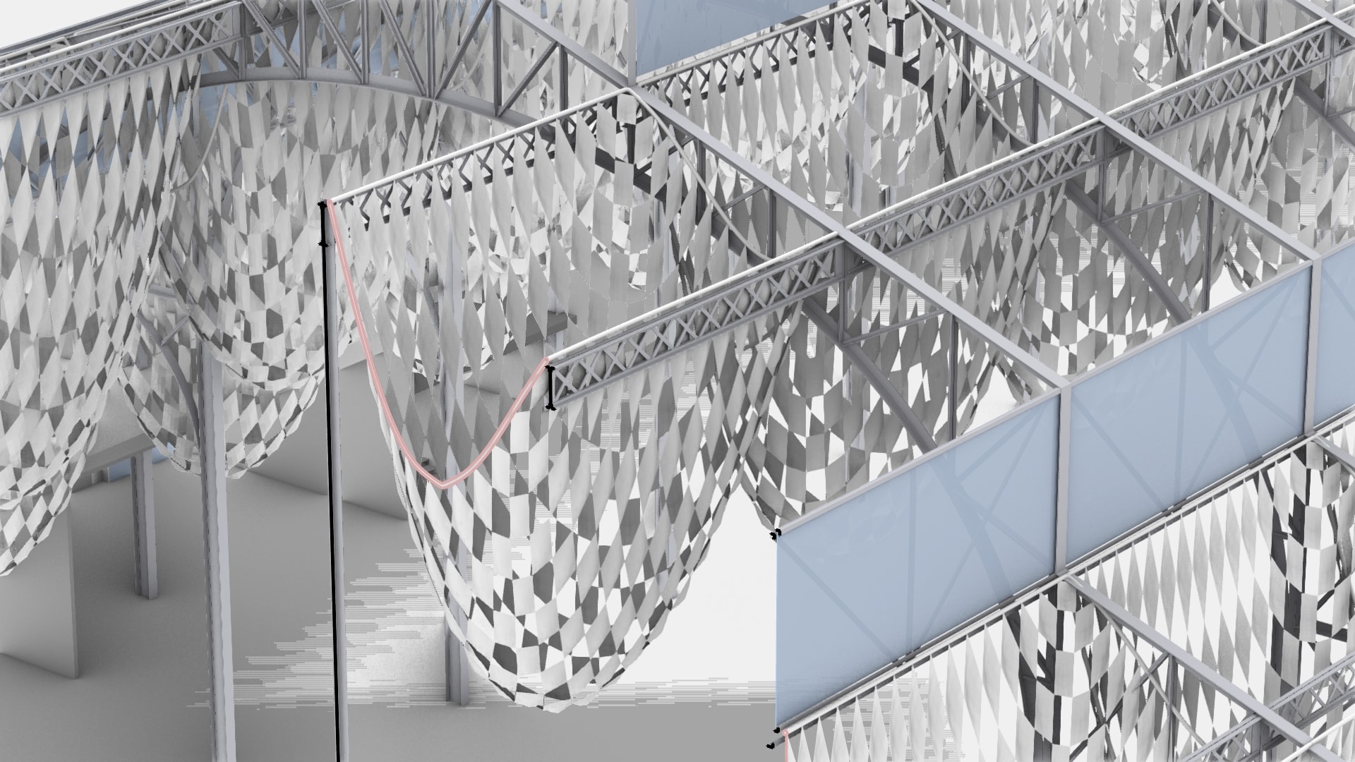 The spatial organization is determined by projecting the lowest points of the fabric curtains onto the ground plane. These projected points serve as geometric anchors that dictate the distribution pattern.