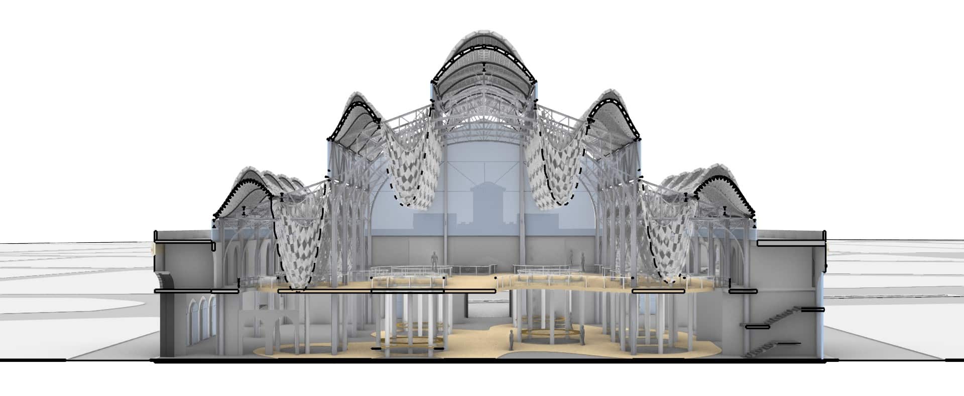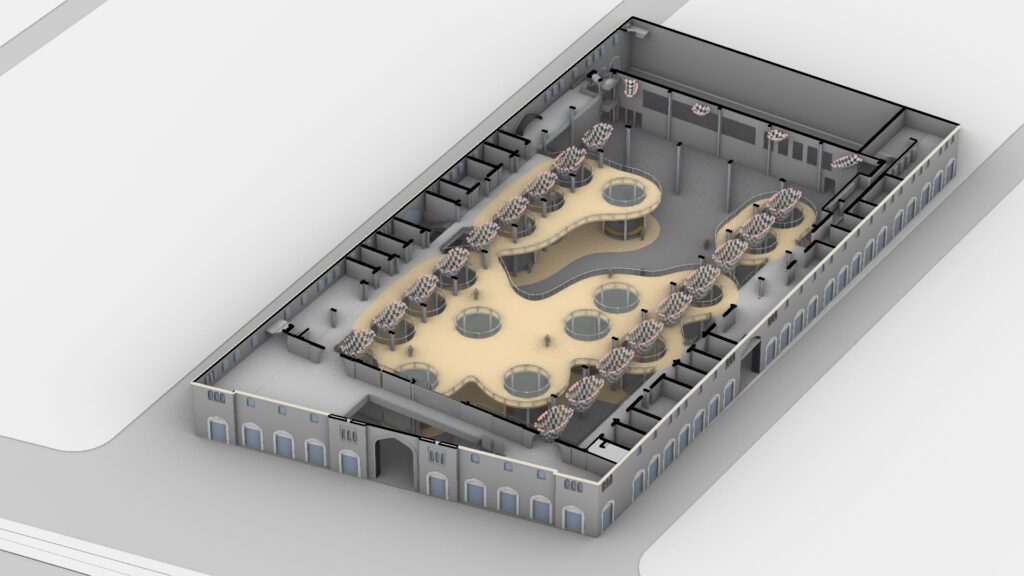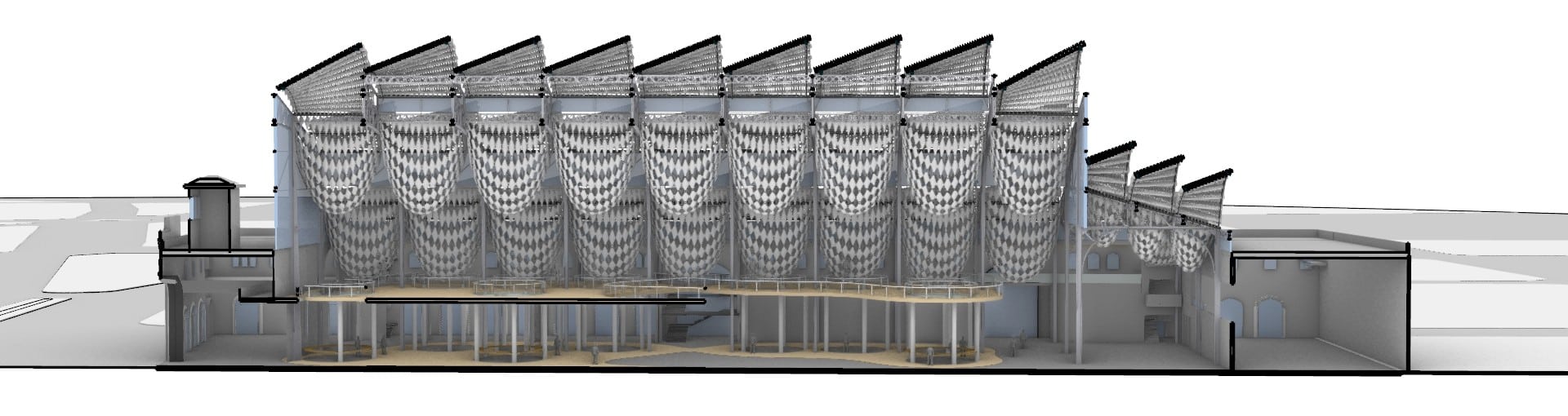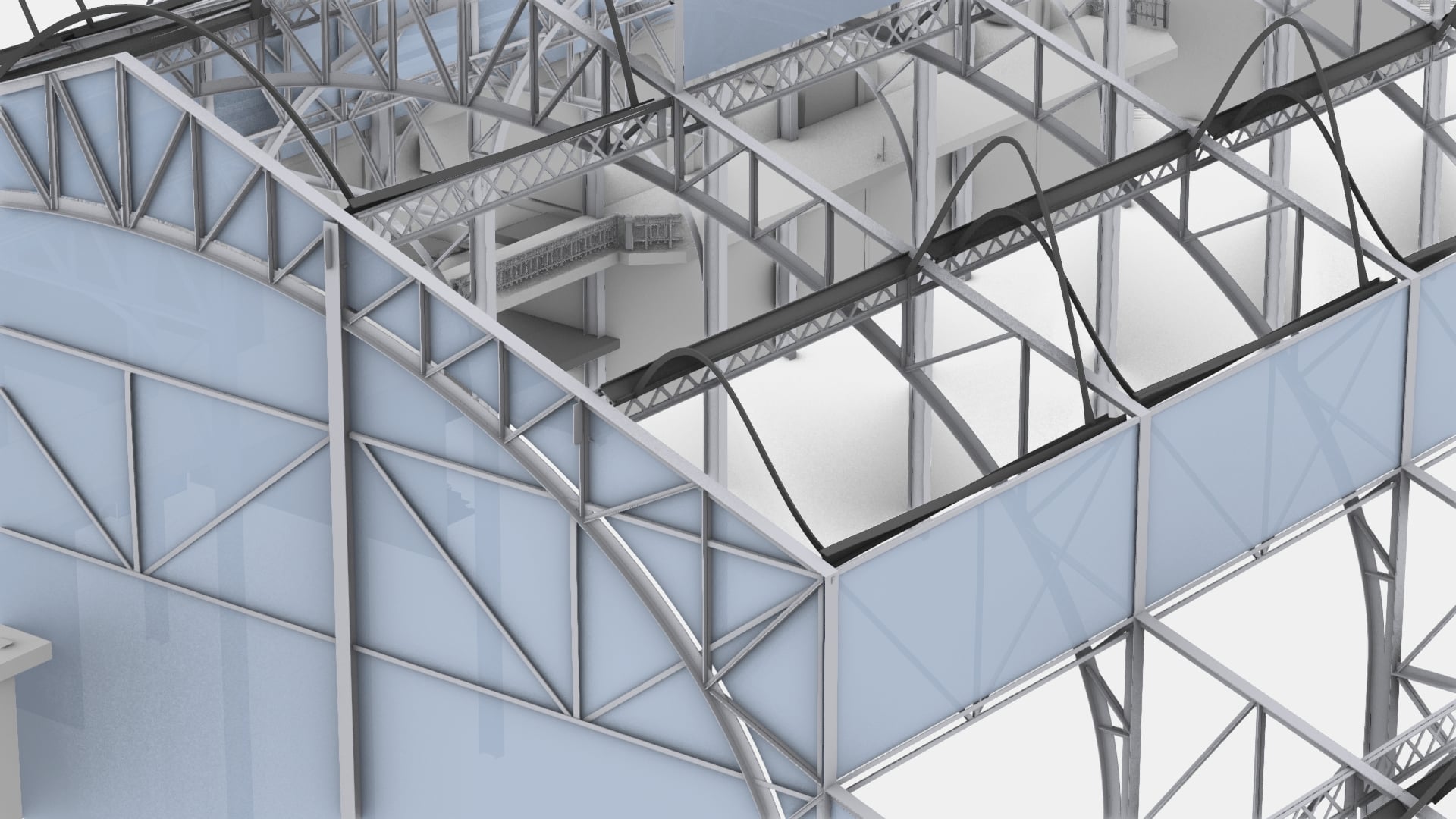 To support the loads of these interlocking vault modules, a new steel structure has been defined. This secondary structure is composed of “I-shaped” cross-section beams and hollow rectangular cross-section profiles, optimized for stiffness and to ensure the necessary support for the vault complex.