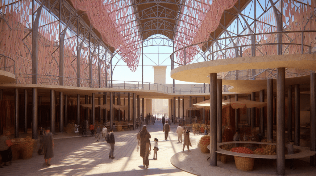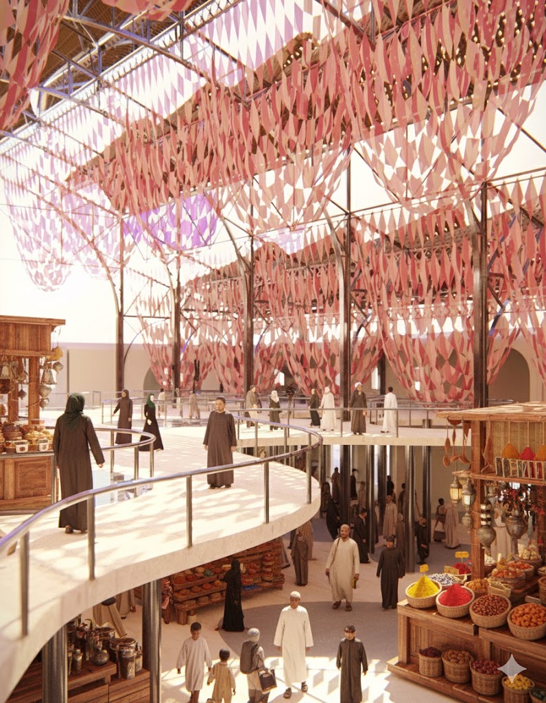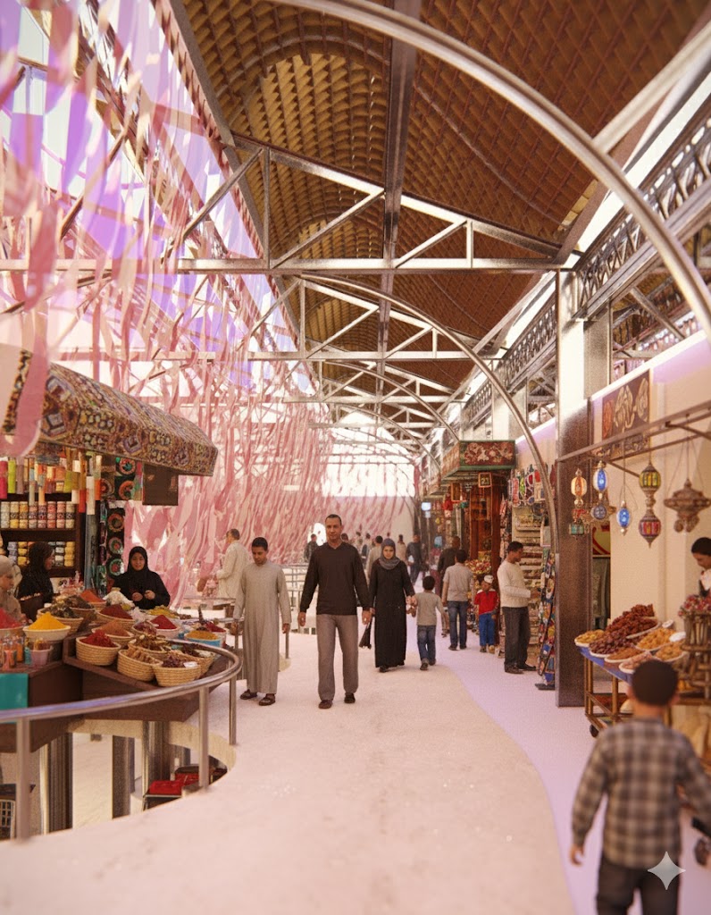Earthen Curtains is a manifesto of computational architecture applied to urban regeneration. The project aims to revitalize the great covered market of Bab al-Luq through the calibrated and performative use of forms, colors, and light. The inspiration from traditional construction techniques, such as the Nubian vaults, is reinterpreted digitally to create an urban oasis. The combination of an adaptive tectonic system and chromatic light modulation transforms the market into a space that is not only functional but deeply sensory, honoring the historical memory of the place while projecting it into a dimension of sustainability and innovation.