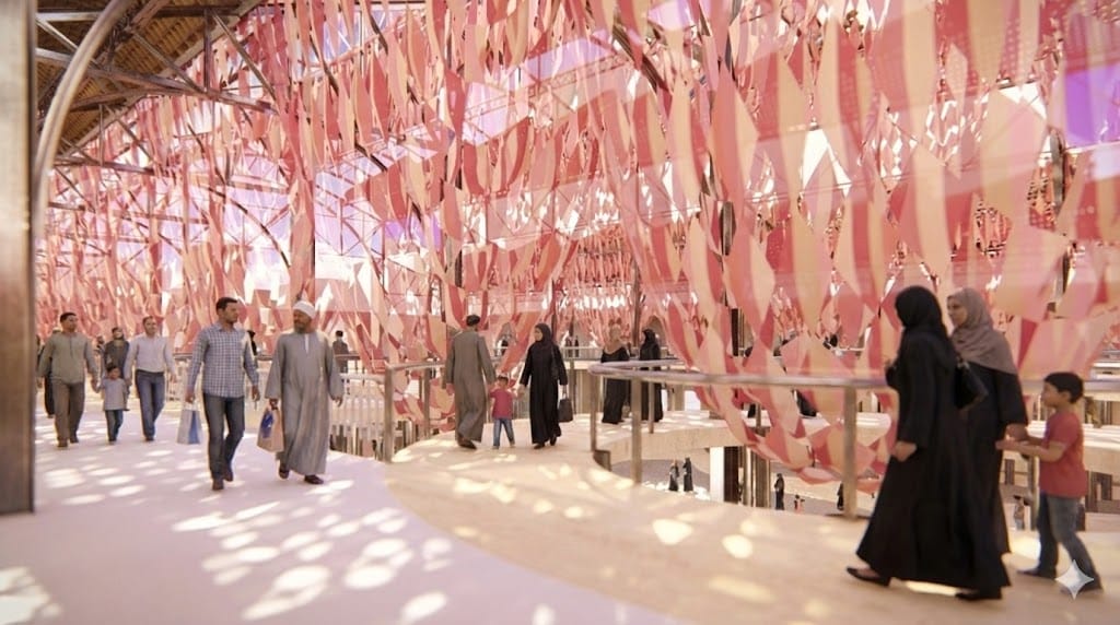 Integrated underneath this adaptive grid are the fabric curtains, selected for their specific light diffusion properties. Their primary function is to filter and soften the light that penetrates, transforming direct radiation into diffuse and comfortable illumination. Crucially, their employment introduces a dynamic chromatic variation within the space. The color of the curtains, interacting with the filtered light and the shadow projected by the tassels, shifts and animates the interior environment, enriching the sensory experience for visitors and market vendors.