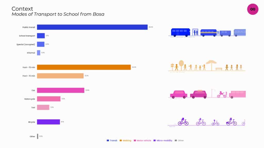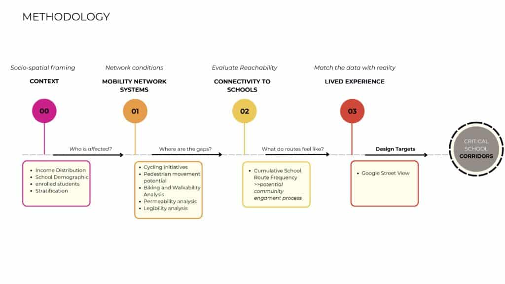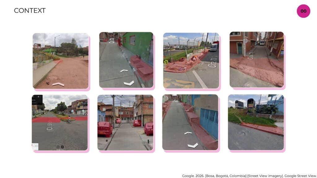 OBJECTIVE: Identify structural fragmentation in everyday mobility networks in Bosa Apogeo, with a focus on school-related and non-motorized trips (walking and cycling) – and develop a framework for improving non-motorized mobility networks that could be applied to other peripheral districts in Bogotá.
