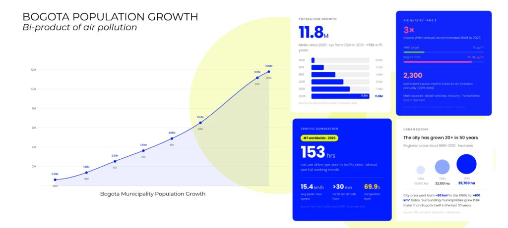 The city currently ranks 7th in the world for time lost in traffic, with drivers spending an average of 153 hours per year in congestion. That is nearly one full working month. Traffic is not just an inconvenience — it is one of the primary drivers of air pollution at the city scale. Bogotá’s PM2.5 concentration sits at roughly 6 times the WHO recommended limit, and the health consequences are significant: approximately 2,300 premature deaths are linked to air pollution each year.