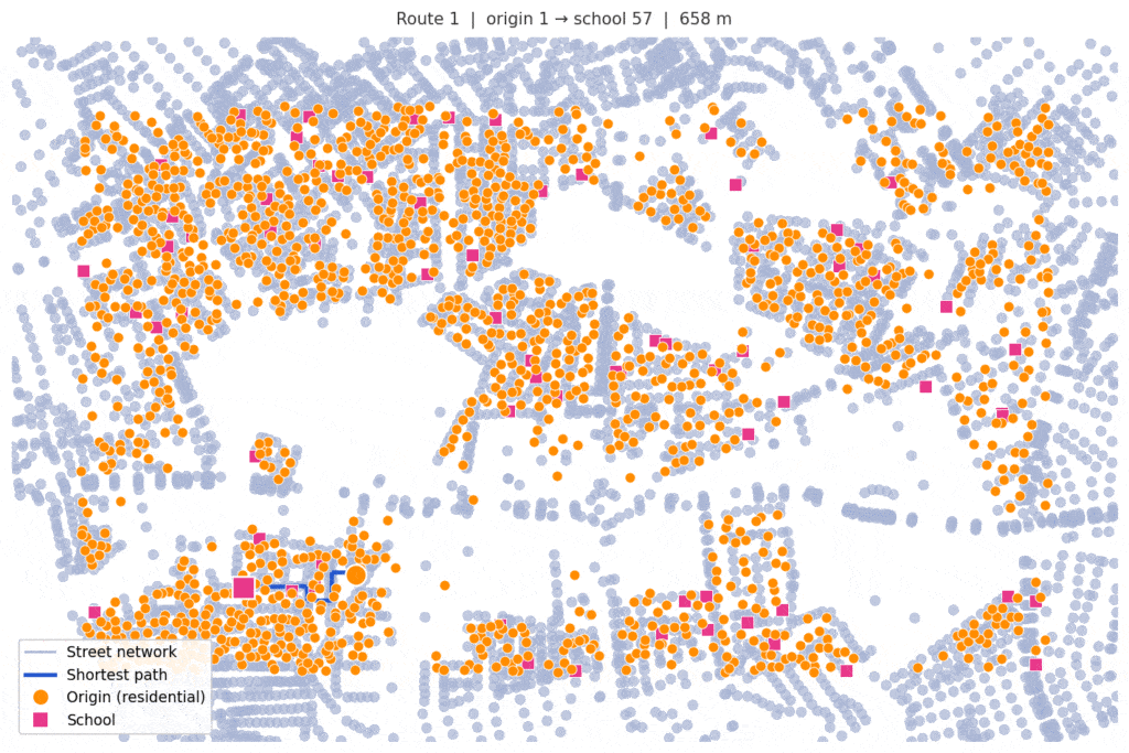 The routing analysis calculates the shortest path from every residential origin to every school. Streets in red appear in the highest number of overlapping paths — making them the corridors with the greatest potential for school trip concentration.