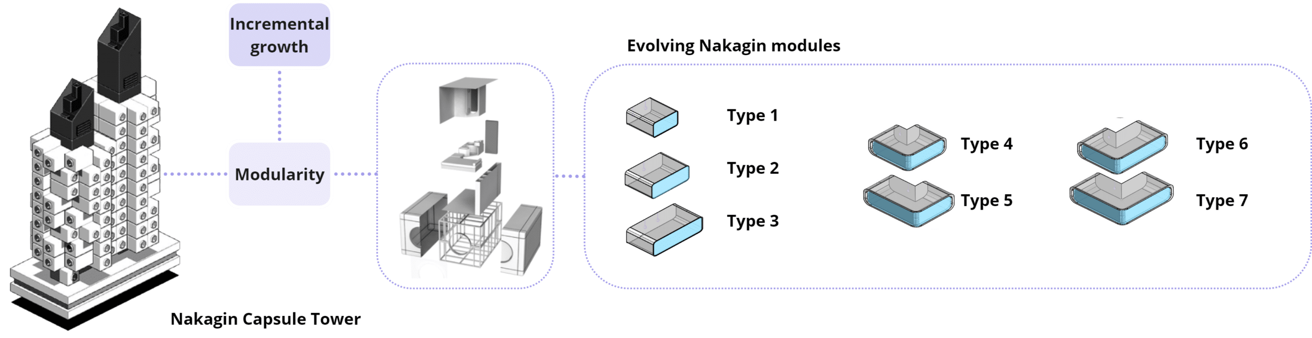 This design strategy prioritizes adaptability, easy customization, and future scalability—enabling the building to be updated or modified beyond its original lifespan, while minimizing environmental impact. Drawing inspiration from the visionary principles of Metabolist architecture, which emphasized modularity, resilience, and the potential for urban forms to evolve like living organisms, our approach fuses these concepts with contemporary sustainable building practices.