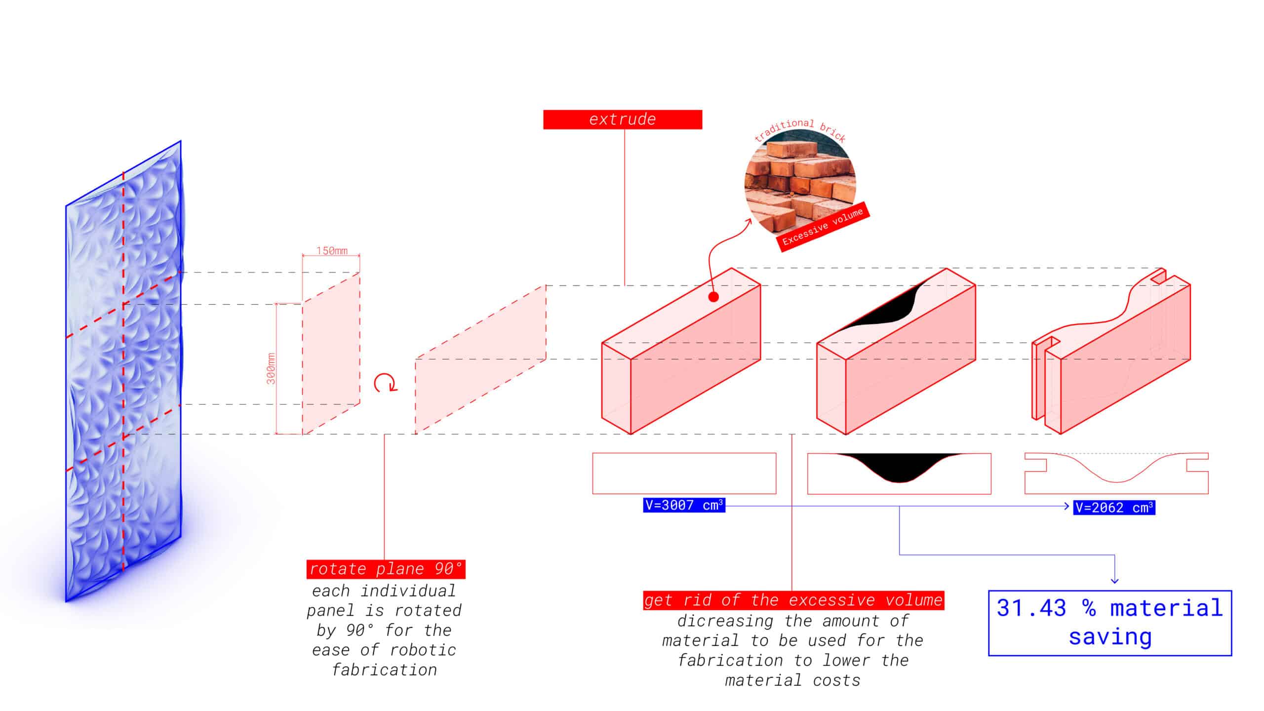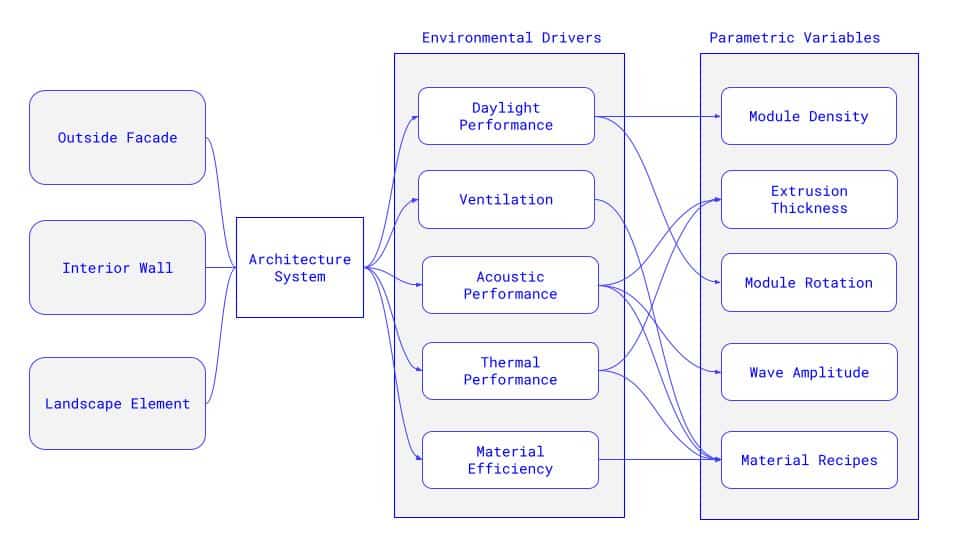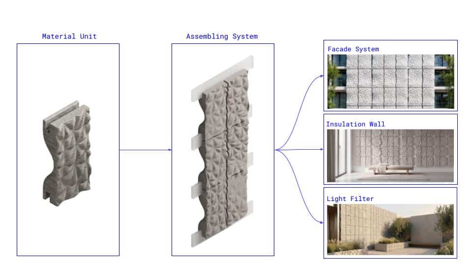 The future application of the tiles lies in their ability to operate as an adaptable architectural system across façades, interior walls, and landscape elements. The development of future application of the tiles can be driven by environmental goals such as daylight performance, ventilation, acoustic control, thermal behavior, and material efficiency, while being tuned through parametric variables like module density, extrusion thickness, rotation, wave amplitude, and material recipes.
