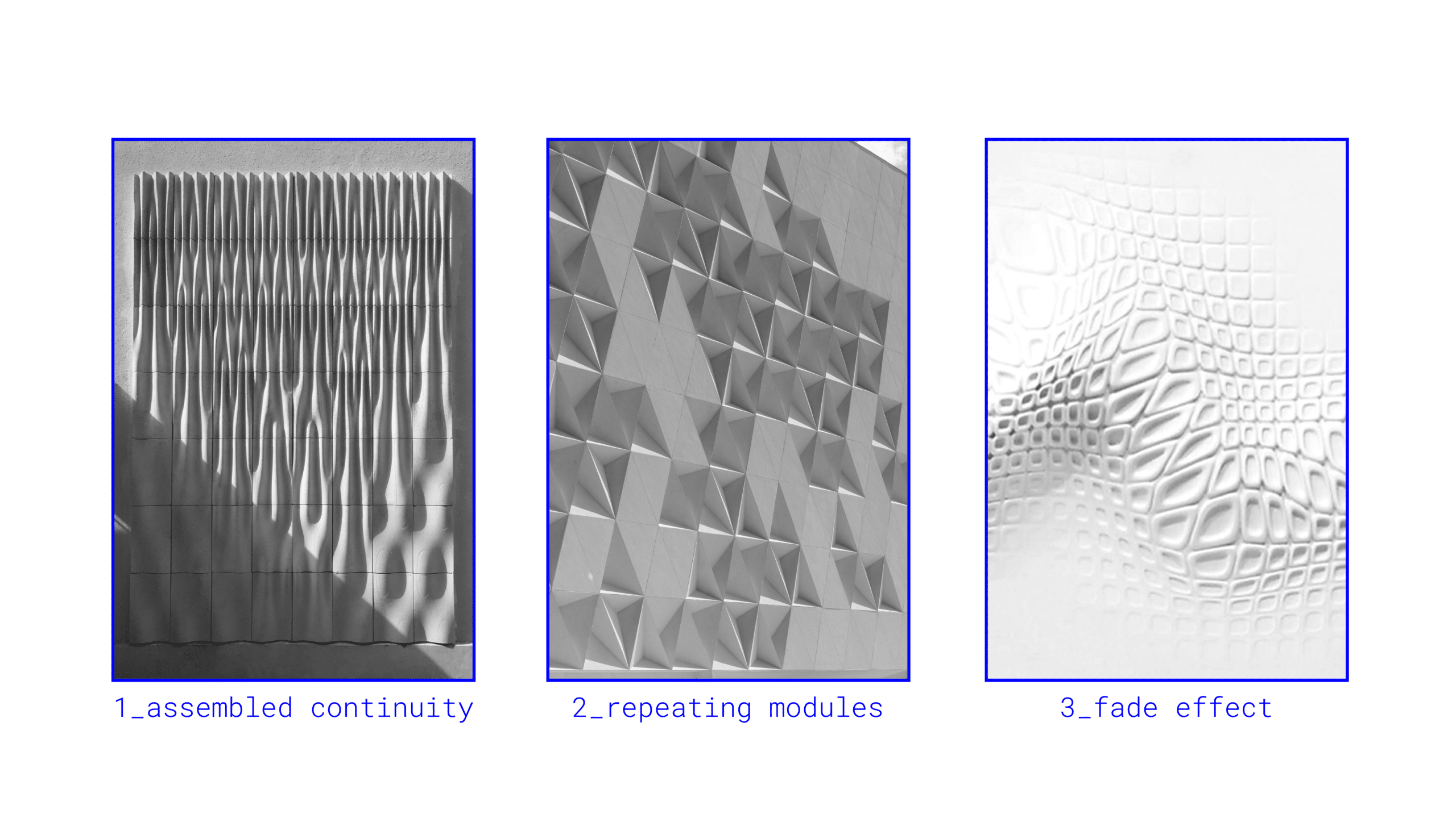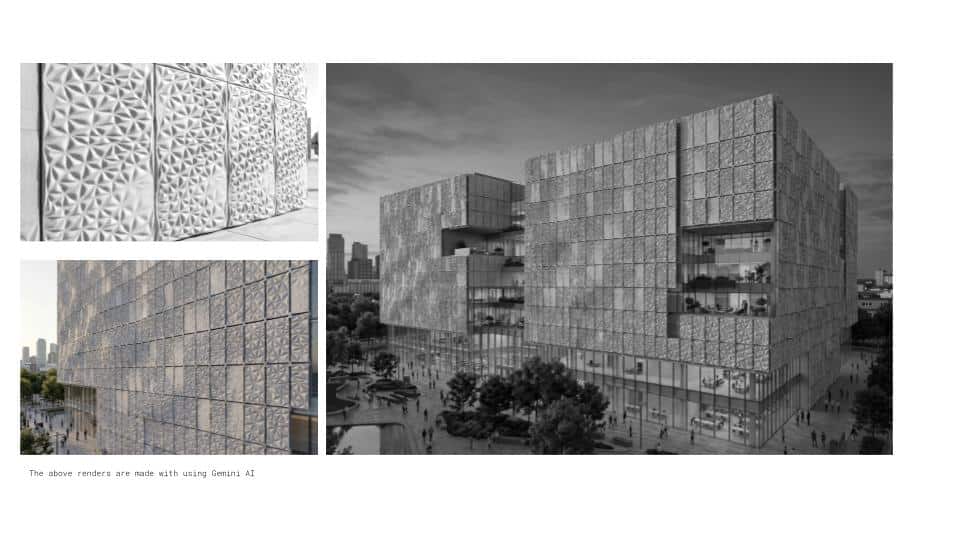The design highlights three main surface strategies: assembled continuity, repeating modules, and fade effects. Together, these examples show how façade systems can move beyond flat, conventional compositions toward more dynamic, spatial, and expressive surfaces.