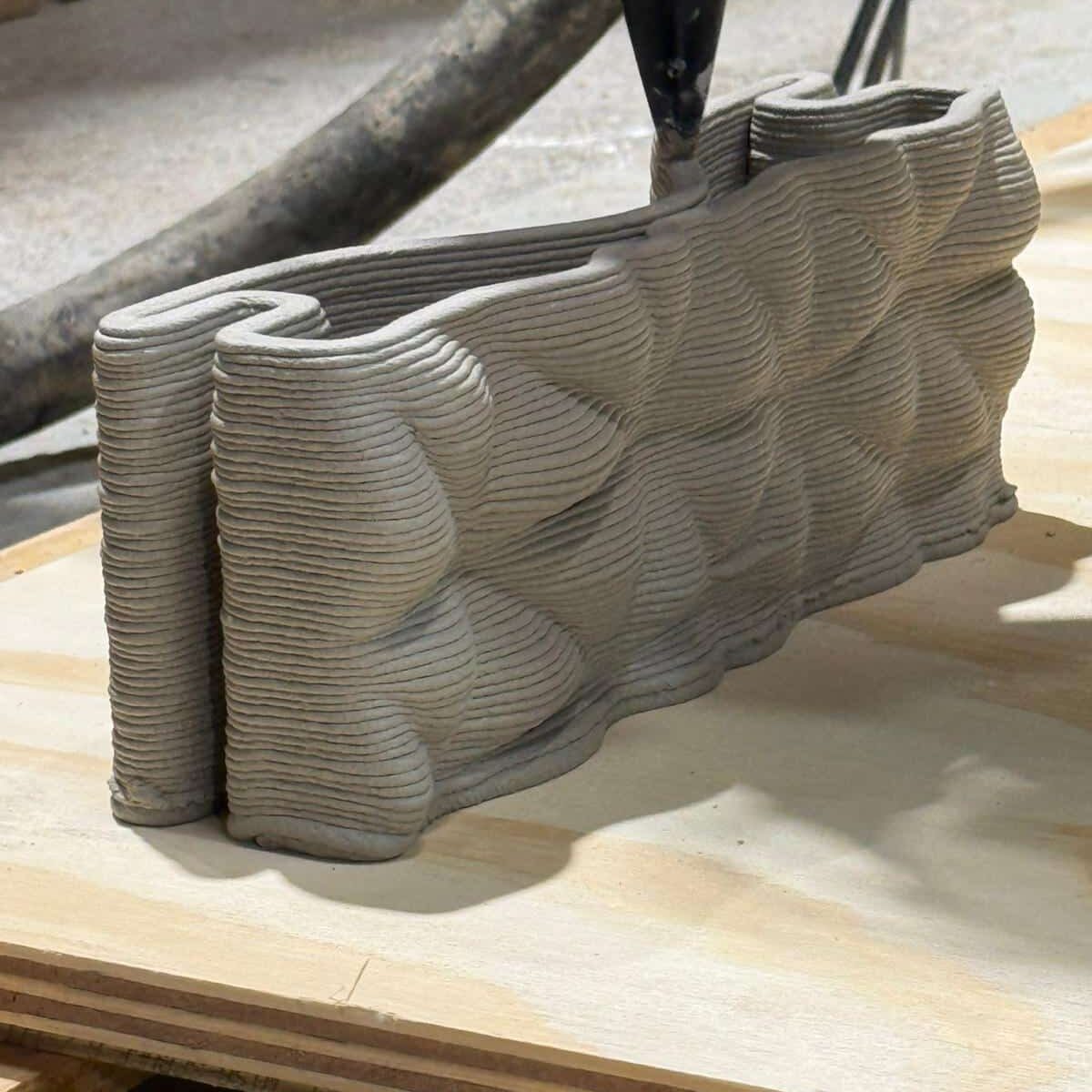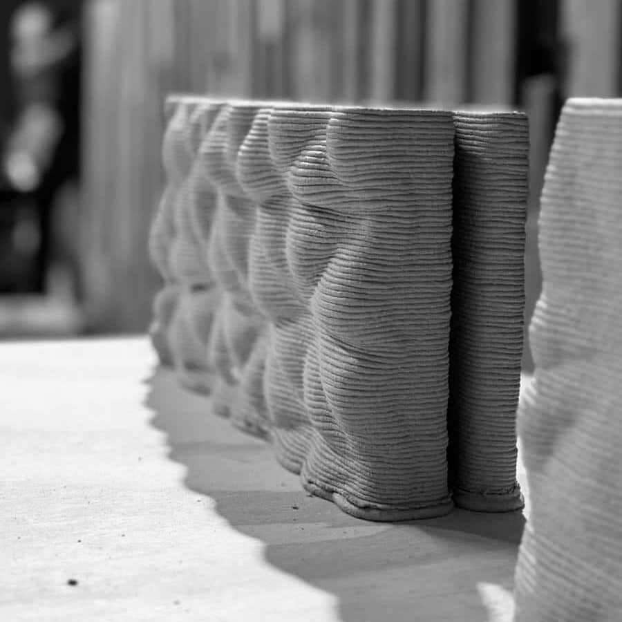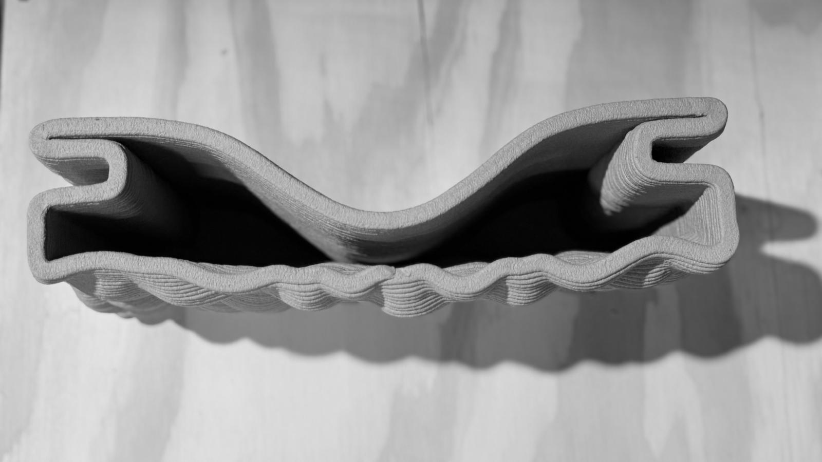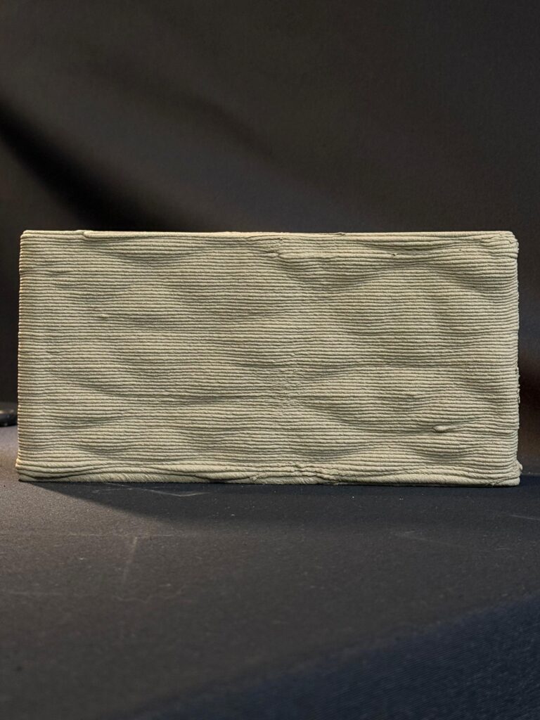 The initial 3D-printed material test reveals early fabrication constraints. Because the designing process only achieved low cantilevers, the resulting physical surface is overly flat and lacks the intended visual drama. To successfully match the digital concept’s striking geometry, future fabrication iterations will need to use refined designing and printing parameters to support deeper reliefs and steeper overhangs, ultimately restoring the intended dynamic surface.
