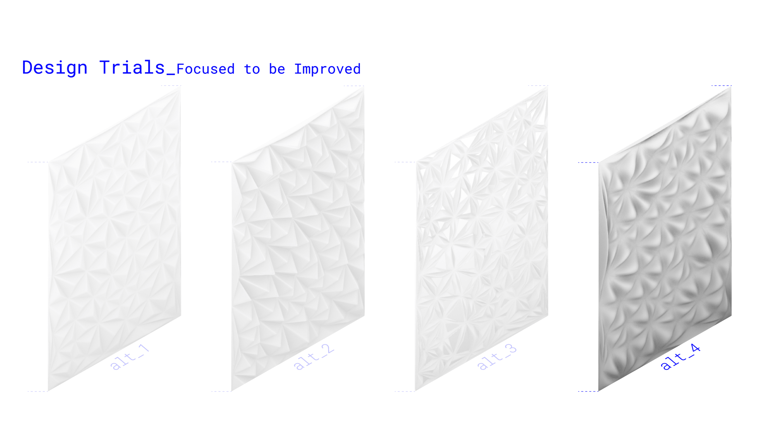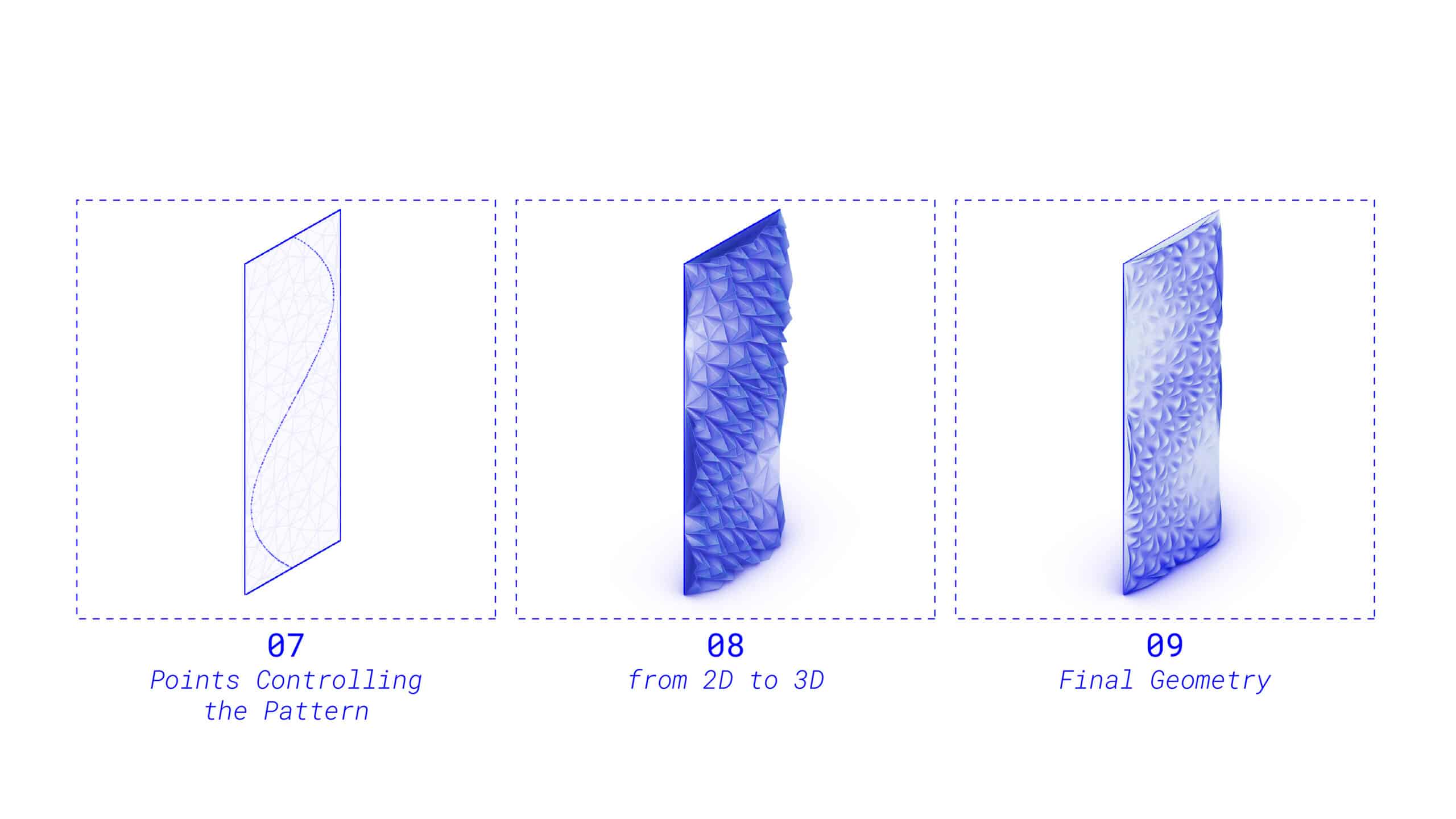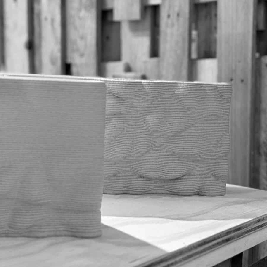 The initial 3D-printed material test reveals early fabrication constraints. Because the designing process only achieved low cantilevers, the resulting physical surface is overly flat and lacks the intended visual drama. To successfully match the digital concept’s striking geometry, future fabrication iterations will need to use refined designing and printing parameters to support deeper reliefs and steeper overhangs, ultimately restoring the intended dynamic surface.