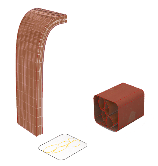 The first step for this task was to again, create an section of the final arch design. Then we create an infill which would go along the arches curvature. Using an inner and outer shell we create a box morph as explained on the next page. This is to follow the curvature path whilst not deforming the infill bricks themselves, since these are what we are printing. Any deformation to the mesh of the infill will heavily affect the printing stage so this allows us to manipulate the geometry without affecting the toolpath of the pieces individually. We then create a rectangular grid to start the organising and second logic step.