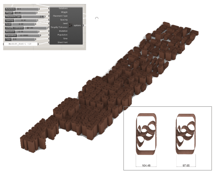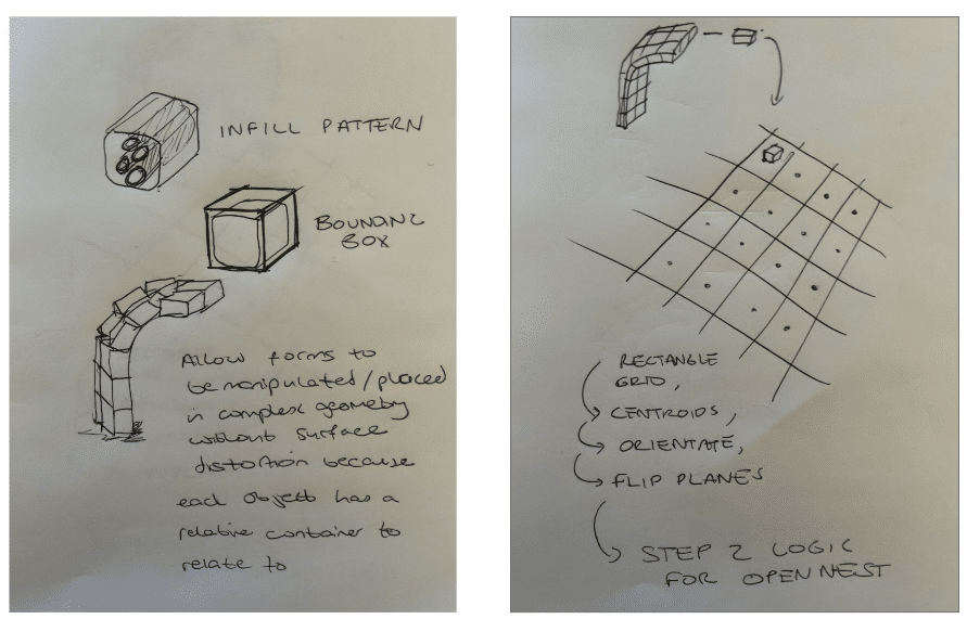 We structured each infill unit inside a bounding box to manipulate it along the curved geometry without distorting its printable form. This ensured consistent toolpaths across all modules. Next, we arranged the modules on a rectangular grid, using centroids and plane reorientation to prepare them for OpenNest. This allowed us to efficiently organize the pieces for fabrication, packing, and transport.