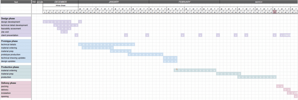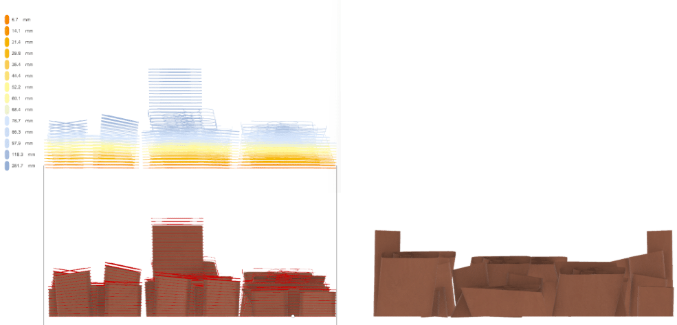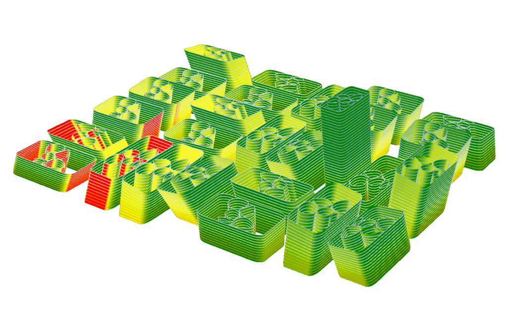 Before moving into the Gantt chart and planning production we can check the design by using analysis tools for the slicing and checking the angle of the slice planes. From the angle analysis we can instantly see some of the prints have heavy initial angles which could cause collapses in production. To avoid this we can increase the number of divisions in the curvature via box morphes to reduce the angle and print smaller objects. Alternatively, we could change the curvature of the design. Since the angles are not so extreme we could tell the robot end effector program to be more precise whilst printing these pieces or place supports for these elements.