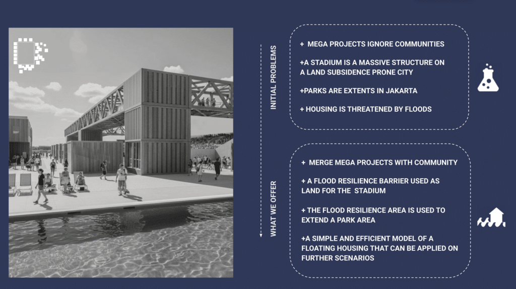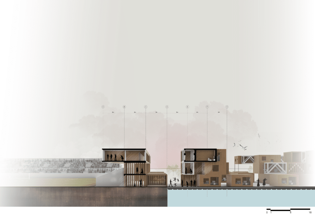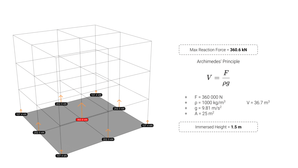 The resulting reaction force under the central column was then used in conjunction with Archimedes’ Principle to estimate the required immersed height of the pontoons, calculated to be approximately 1.5 meters.