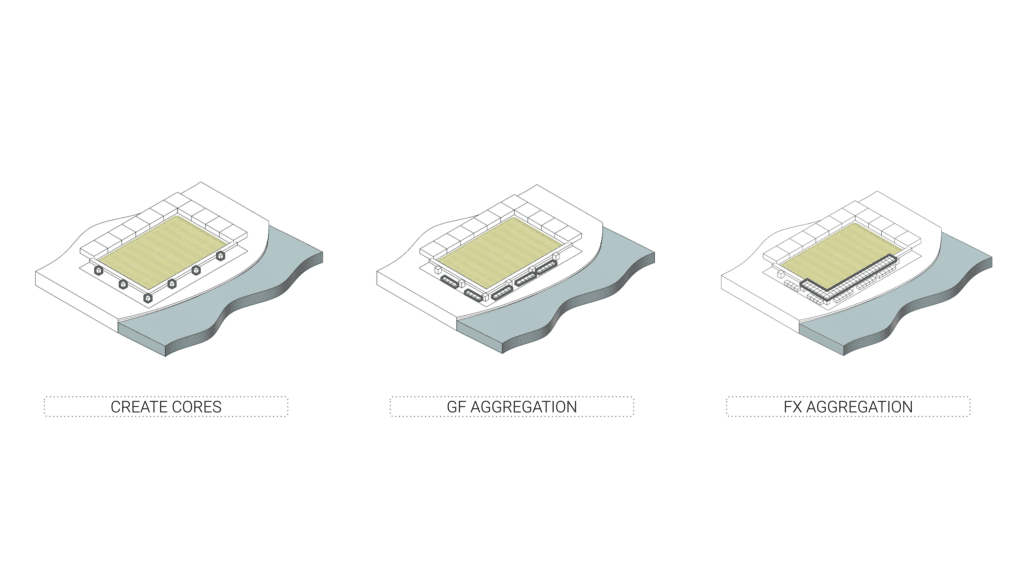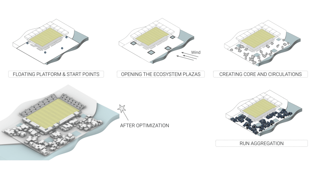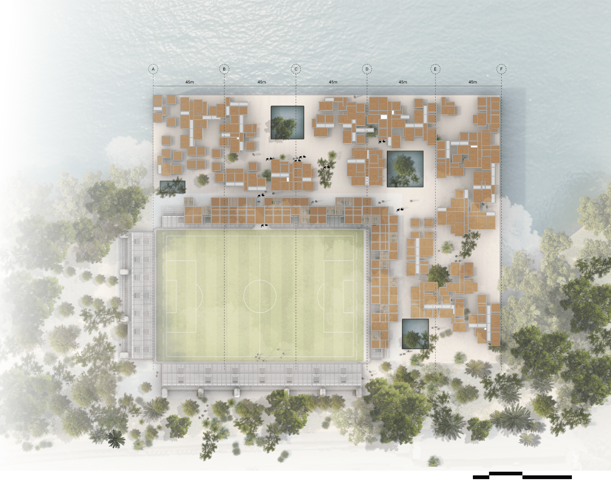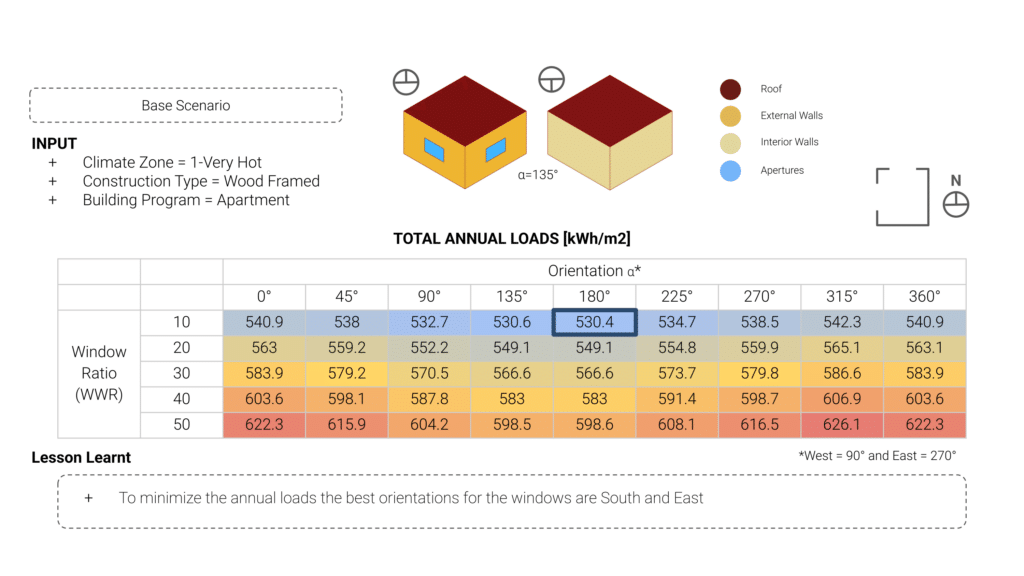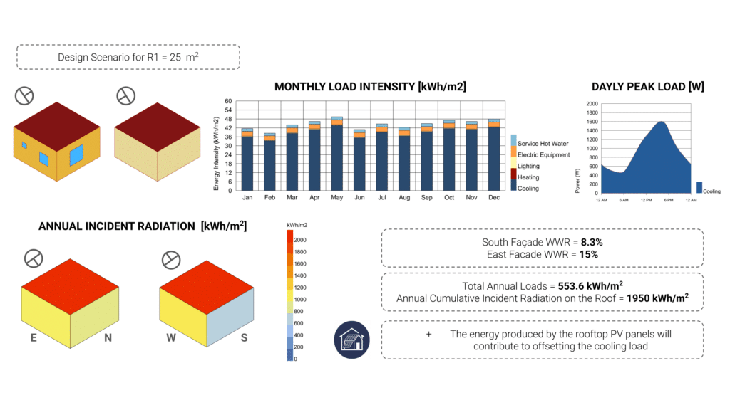 The study revealed that South and East orientations, combined with low window ratios, minimize annual energy loads. These findings directly informed the placement and orientation of the residential aggregation around the pitch.